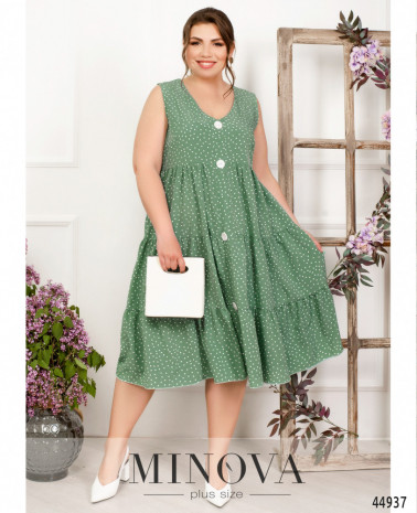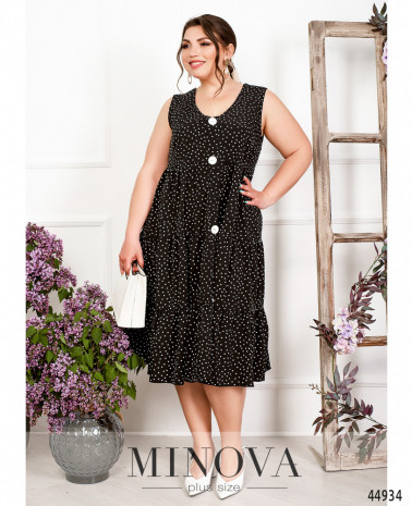 Женственное платье батал без рукавов, вырез горловины полукруглый, на подоле - мягкие оборки. По бокам карманы в шве. Застёжек нет.