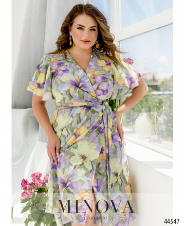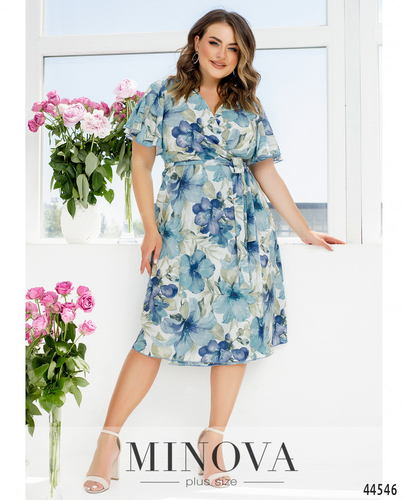 Елегантна жіночна сукня батал з принтом, виріз горловини півкруглий, застібка - вшита по спинці блискавка, кишень немає. Поділ відрізний, спадає плісованими оборками. Ліф та поділ з м'яким нижнім шаром, верхній шар напівпрозорий. Рукава без підкладочного шару, на зап'ястках вшиті резинки. На талії повздовжні виточки вгору.