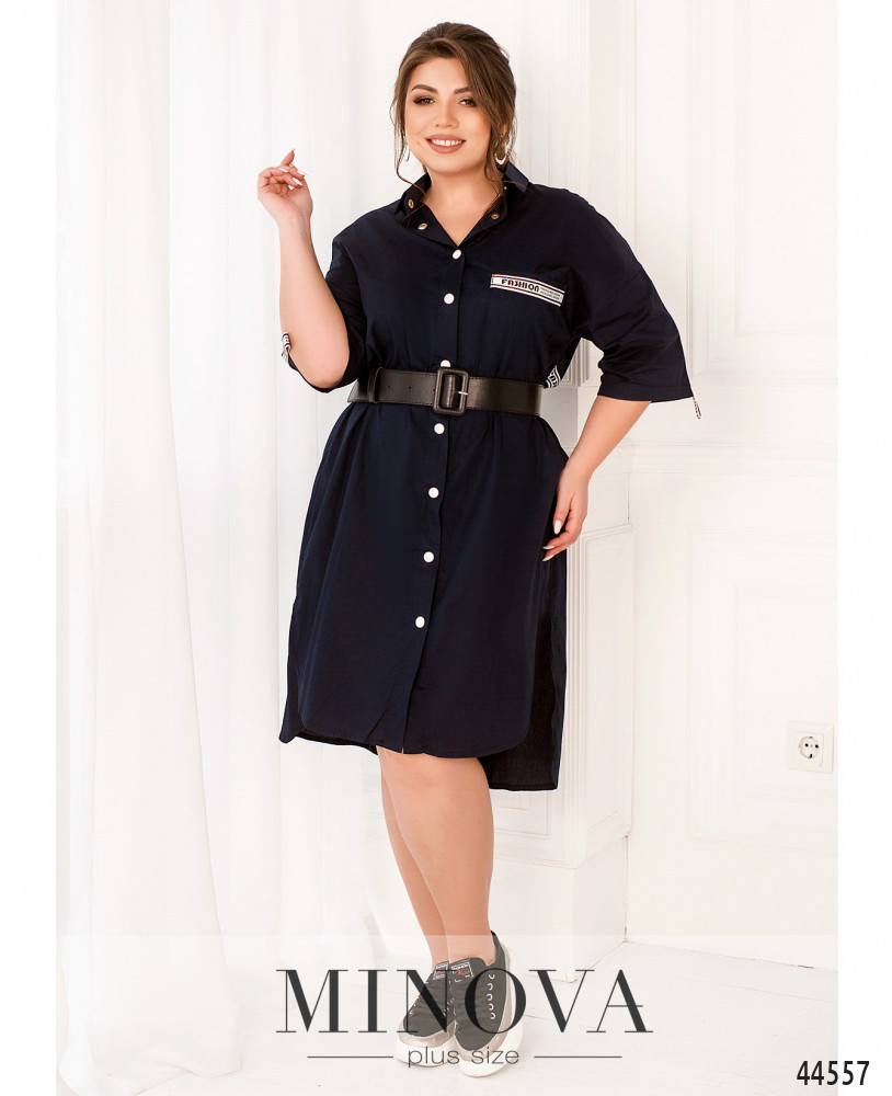 Стильна сукня батал в стилі сорочки: відкладний комірець, низка кнопок спереду на планці. На грудях накладна кишеня. Кишеня і рукава, а також відрізний по спинці поділ прикрашені декоративною стрічкою. Поділ по спинці розходиться від оборки по центру. З боків подолу - невеликі скруглені розрізи. Кишень з боків немає.
