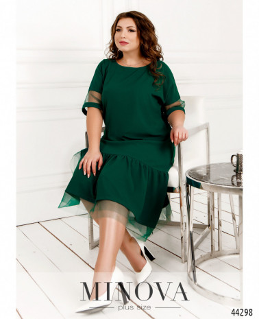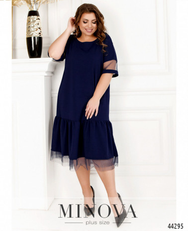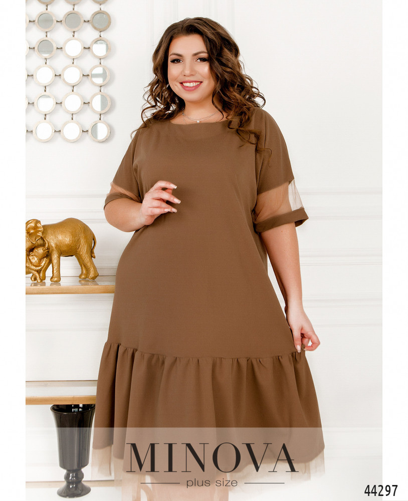 Романтичное платье-рубашка большого размера с поясом в тон, воротничок - небольшая стоечка. Застёгивается на ряд пуговиц спереди на планке, от воротничка до низу. Рукава с удлинёнными манжетами, на манжетах по одной пуговке. Верх украшен ажурным кружевом спереди и по спинке. Карманов нет.