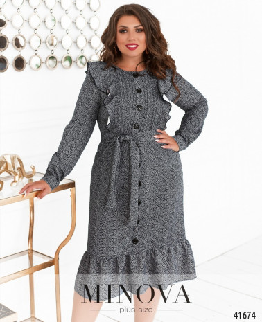 Элегантное платье батал с декоративными пуговицами на рукавах. Вырез горловины неглубокий, полукруглый. Ткань от выреза спускается оборками. Силуэт приталенный, по бокам - врезные карманы. Застёгивается на молнию, вшитую по спинке.