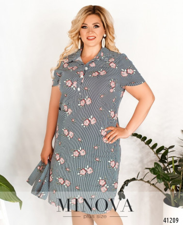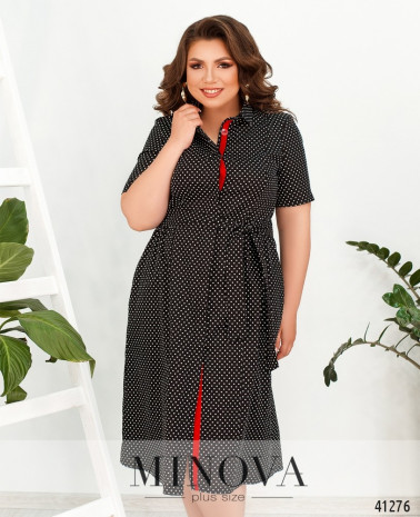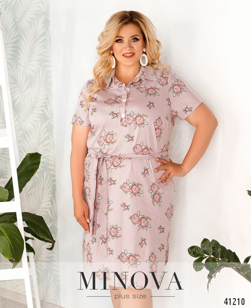Очаровательное повседневное платье-рубашка батал с отложным воротничком и рядом пуговиц спереди на планке, от воротничка до груди. Справа на бедре - накладной карман, по бокам подола - разрезы. В комплекте - пояс в тон.