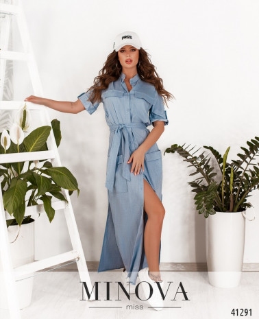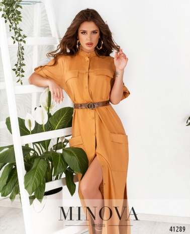 Удобное повседневное платье с декоративными клапанами на груди, на бёдрах спереди - накладные карманы. Застёгивается на ряд пуговиц спереди на планке, до подола. На подоле по бокам - разрезы. Воротник - небольшая стоечка. Рукава с регулировочной лентой и пуговицей, а также с разрезами сбоку. В комплекте - пояс.