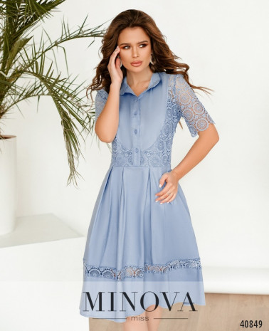 Нежное платье с ажурным кружевом на подоле и на лифе, рукава выполнены из кружева без подкладки. Подол подшит к лифу и присобран оборками. Застёжка - ряд пуговиц спереди на планке, от воротничка до талии, и ещё одна - слева сбоку, вшитая молния. Спинка без кружевных вставок. По бокам - врезные карманы.
