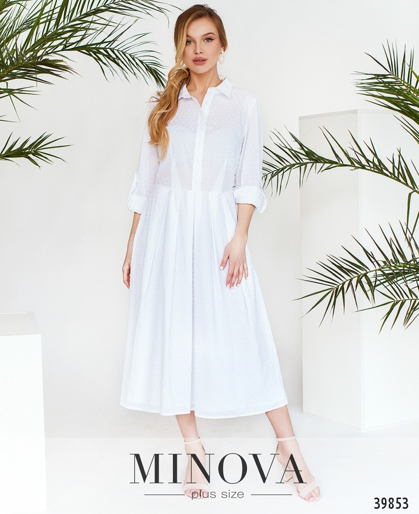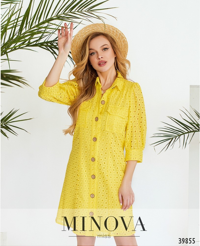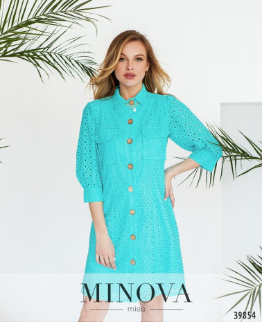 Стильное платье с накладными карманами на груди. Застёгивается на ряд пуговиц спереди на планке, воротничок отложной, рукава с манжетами, без пуговиц. Платье с ажурным верхним слоем и с мягким нижним, подшитым к верхнему.