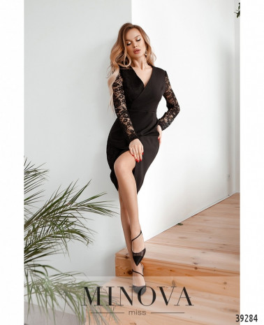 Элегантное и очень оригинальное платье с подолом и лифом, подшитыми на запАх. Правая сторона - с кружевным верхом и мягкой тканью снизу, левая - гладкая. Рукава из прозрачного кружева с небольшими уплотнениями-манжетами. Спереди на лифе - поперечные и продольные вытачки. Карманов нет, застёжка - вшитая по спинке молния, сзади на подоле шлица.