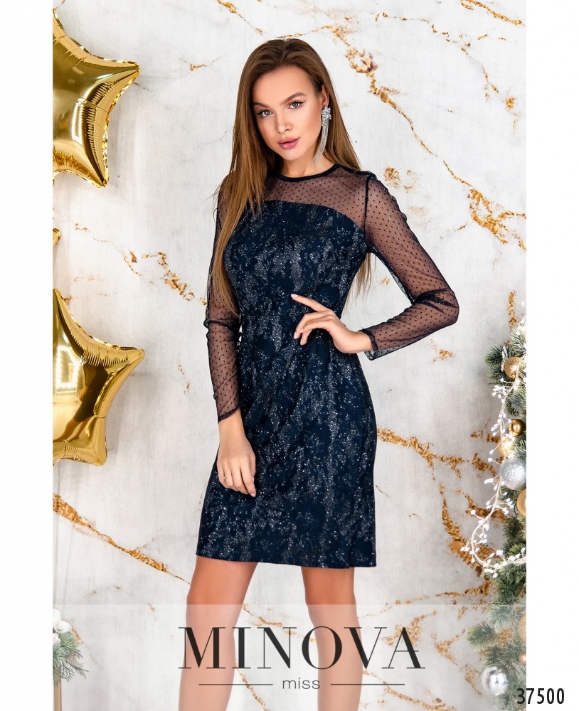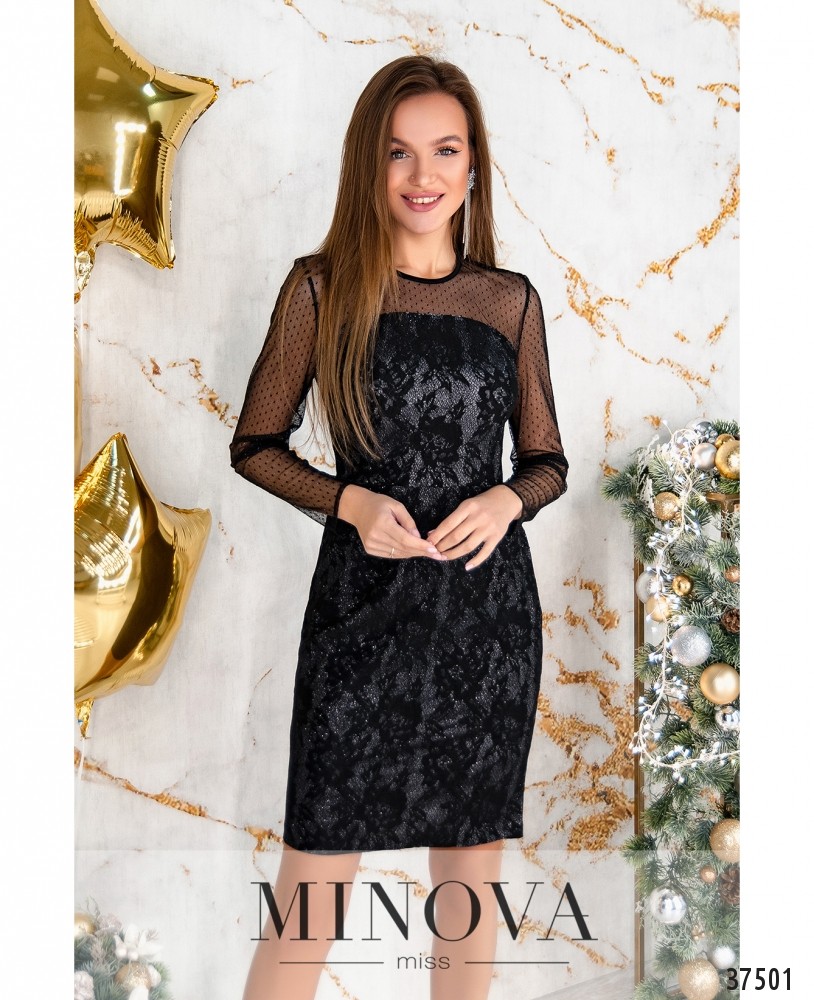 Елегантна вечірня приталена сукня з люрексом та блискітками. Плечі та рукава – з напівпрозорої сіточки з блискітками. Рукава та поділ прикрашені оборками з сіточки. Спинка та передня частина повністю закриті. На тканині зверху – квіткові візерунки. Застібається на вшиту по спинці змійку, кишень немає. Виріз горловини півкруглий, ущільнений.