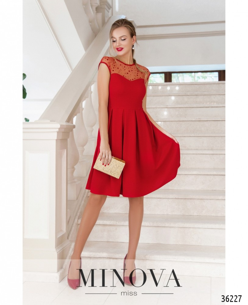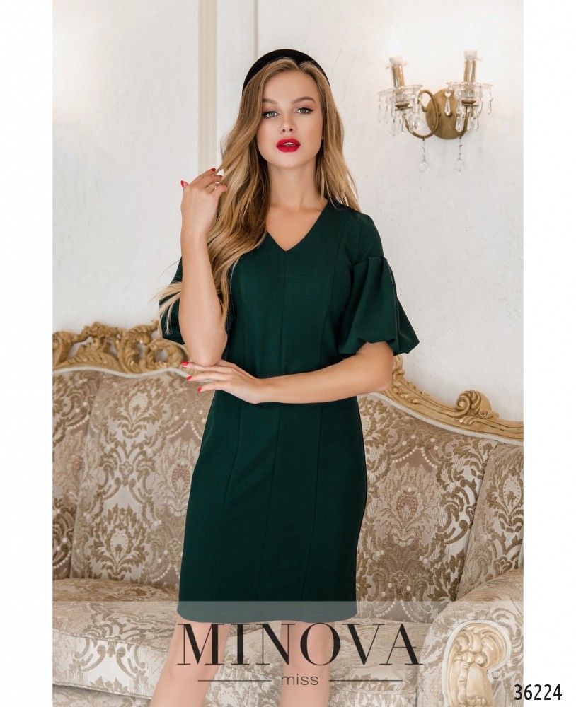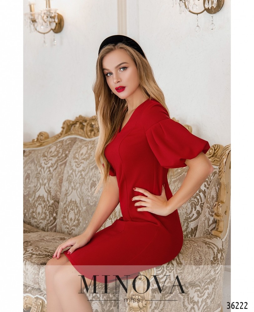 Стильна сукня з штучної шкіри з м\'якою підкладкою зсередини. Застібається на повний ряд металічних заклепок, виріз горловини V-форми, не занадто глибокий. Є накладні кишені з боків та пояс з круглою пряжкою. На плечах підшиті невеликі погончики з металічними кнопками, на рукавах на місці манжетів також стрічка з кнопками. Рукава довжиною ¾. Довжина міді, дещо нижче коліна.