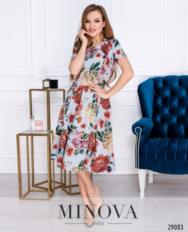 Романтичное платье в цветочный принт с юбкой в складку. Отрезной лиф с короткими рукавами скроен с вытачками на груди. Отрезной расклешенный подол собран в легкие складки, которые придают объем подолу. На спине платье застегивается на молнию.