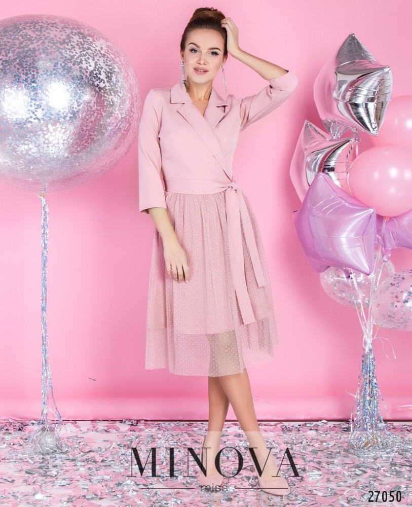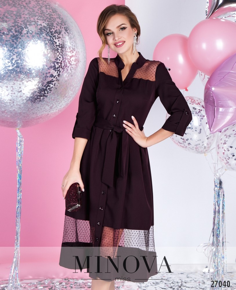Элегантное, романтичное платье прямого силуэта с оригинальным вырезом. Воротник декорирован ярким пришивным украшением (украшение съёмное). Длинные, легкие рукава с креп-шифона с разрезами на наружной стороне на манжете с пуговицами. По спинке идет потайная молния и выточки по задней планке.