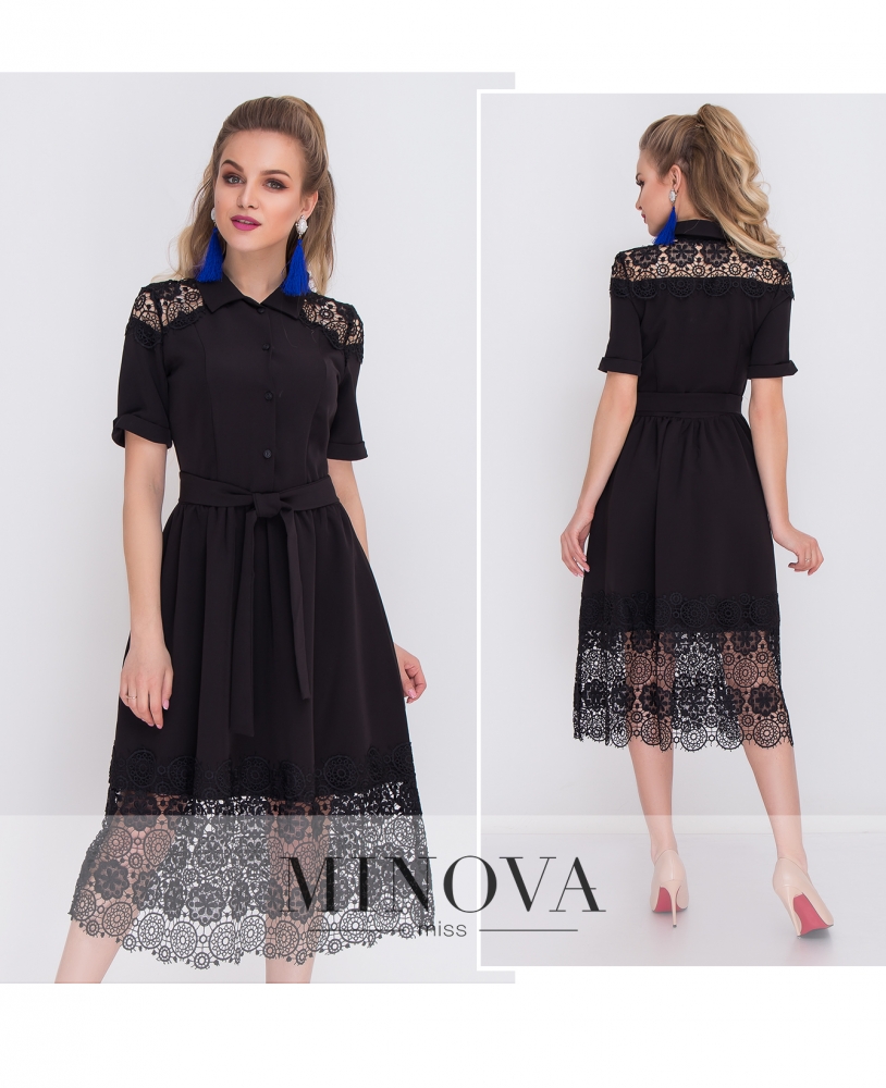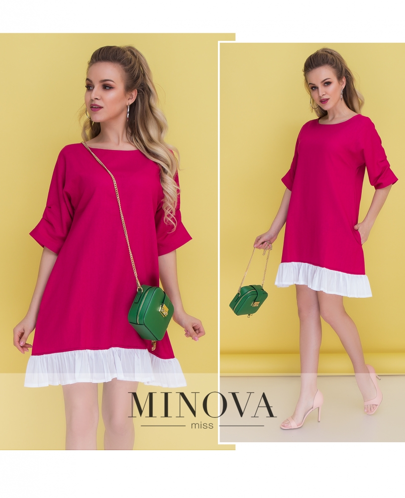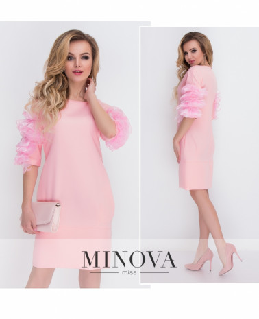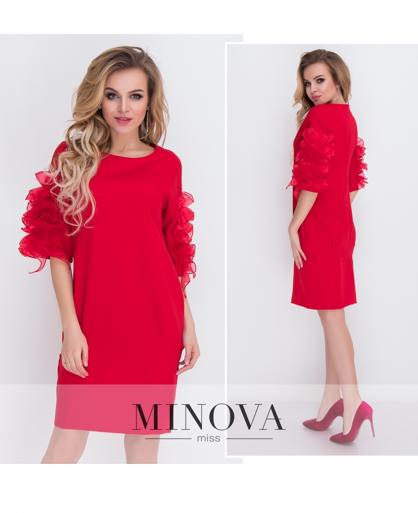 Романтичное платье прямого кроя с объемными рукавами. Рукава длиной до локтя изготовлены из сетчатых воланов. Внизу отрезной подол дополнен защипами и карманами. На спинке платье застегивается на скрытую молнию.