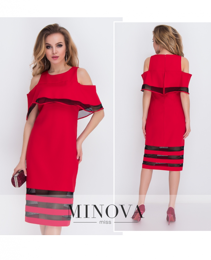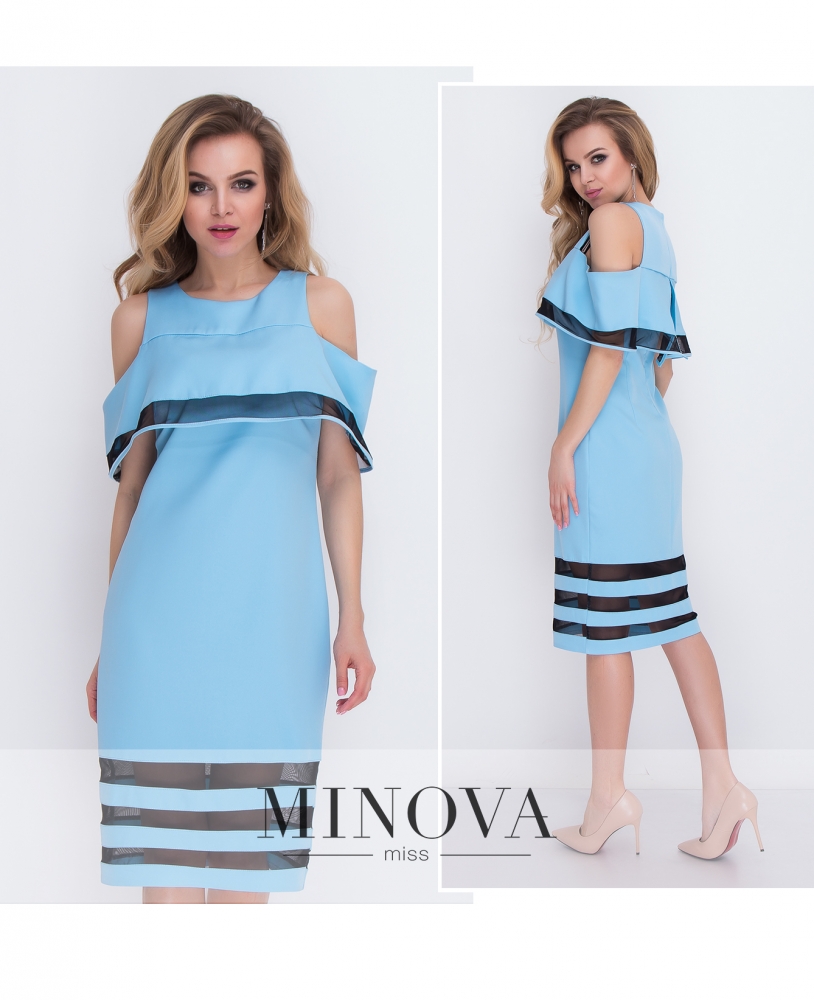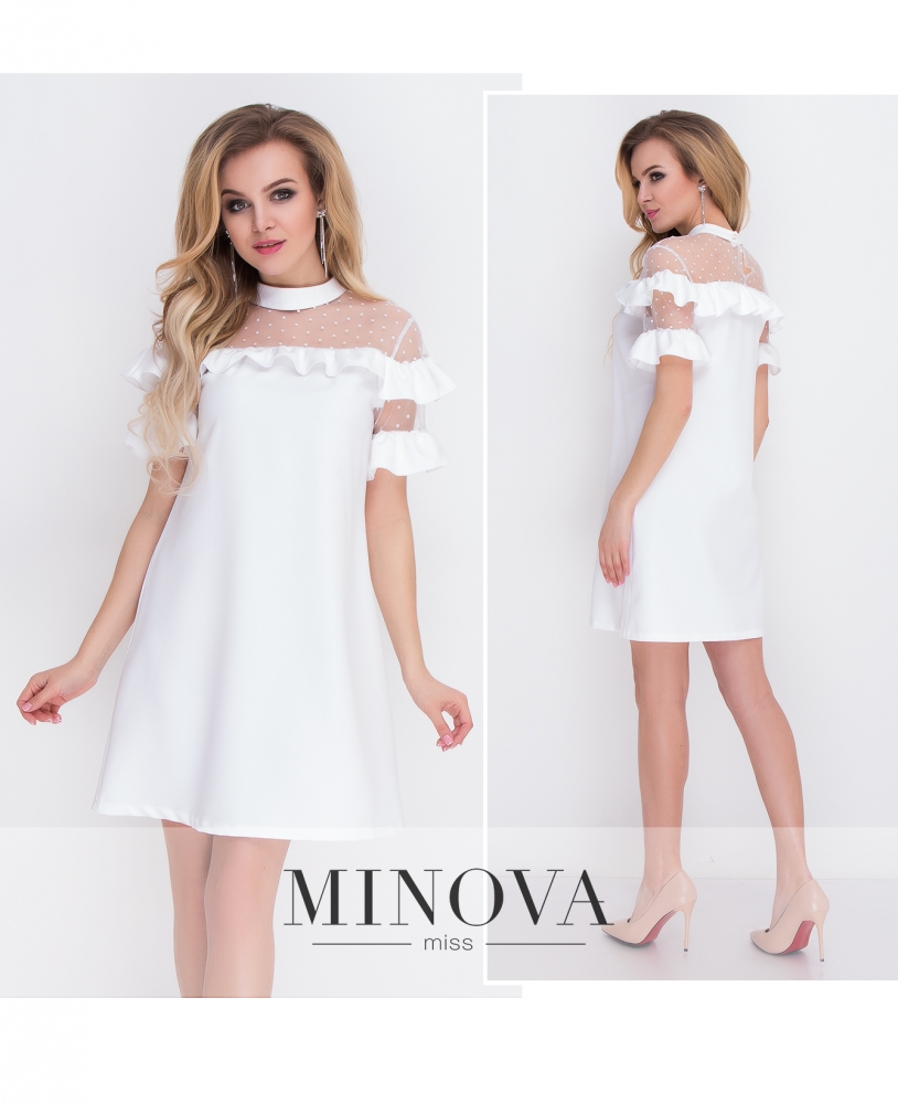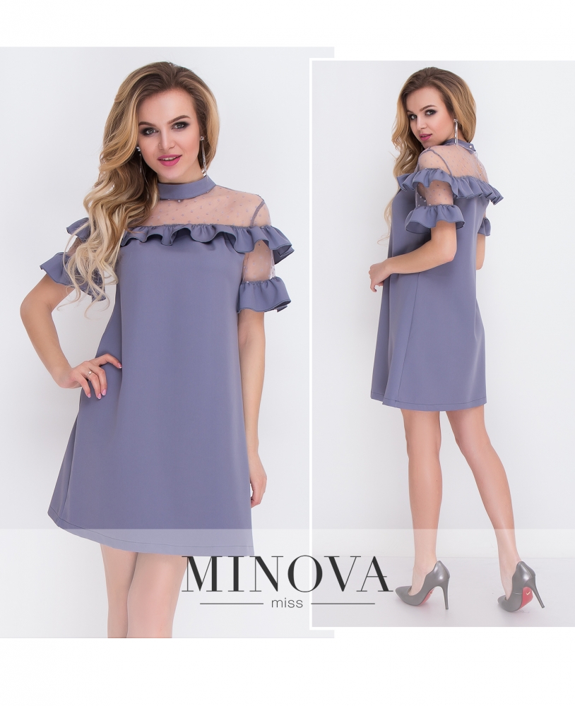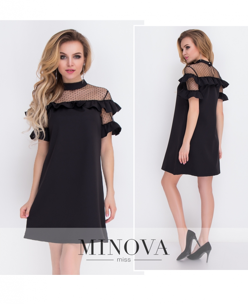 Оригинальное платье А-силуэта с воланами вдоль линии плеч и на рукавах. Верхняя часть с высокой горловиной изготовлена из прозрачной сетки в горошек. На спинке горловина застегивается на пуговицу.