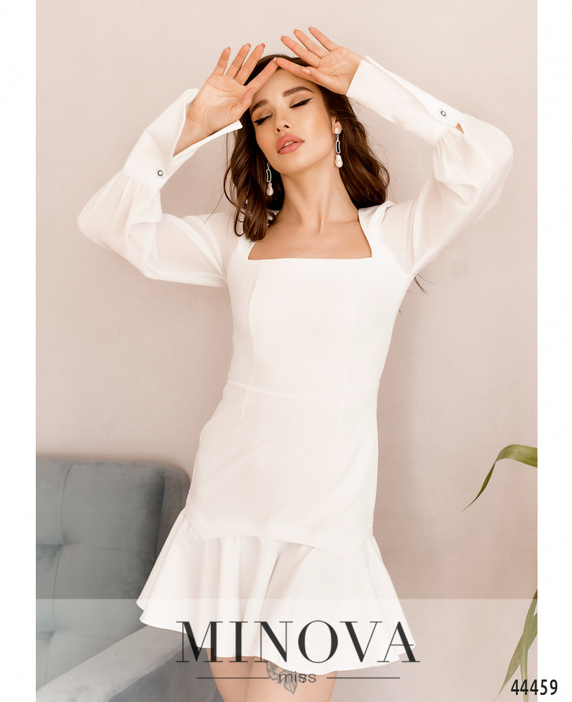 Нежное и очаровательное платье приталенного силуэта с баской на талии. Подол фасона "карандаш". Рукава расклешённые, с разрезом по шву. На груди вытачки. Верх лифа и плеч спереди украшен полупрозрачной сеточкой, вырез горловины спереди неглубокий, V-образный, по спинке более глубокий, полукруглый. На баске сзади разрез по центру. Застёжка - молния, вшитая по спинке. Карманов нет.