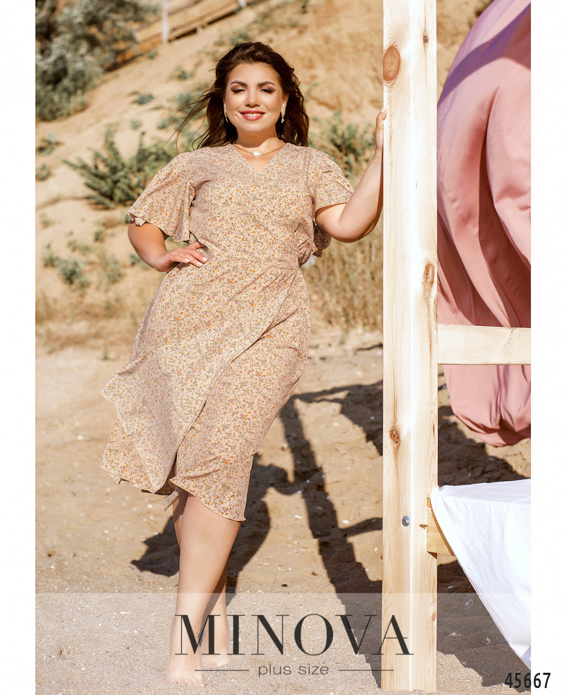 Стильное платье большого размера с коротким рукавом, без застёжек и карманов, с широким полукруглым вырезом горловины. Через талию пропущен шнурок под кулиской, подол ниспадает мягкими оборками. Пояс НЕ входит в комплект.