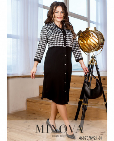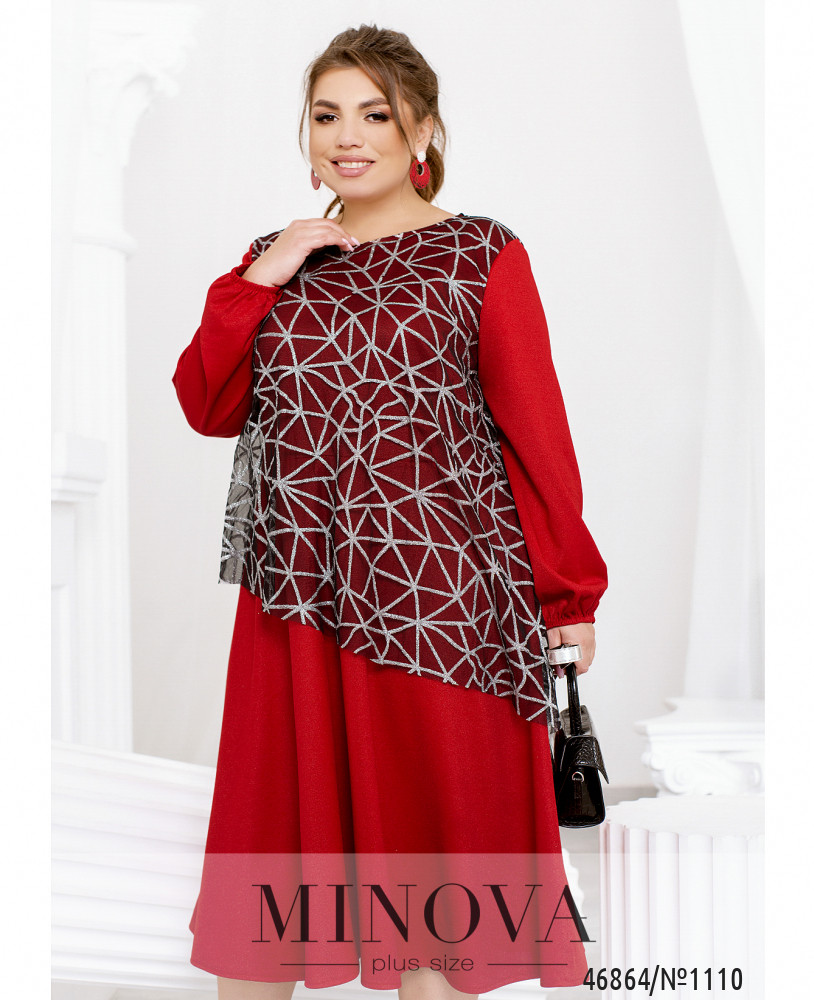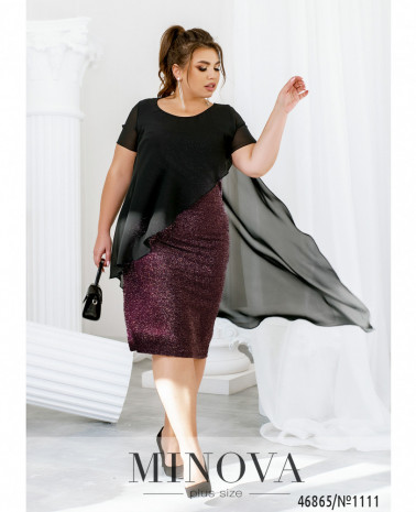 Елегантна сукня з двошаровим ліфом, ідеально сідає по фігурі, незалежно від її особливостей. Верхня частина ліфа - асиметрична і сяюча, а нижня частина, рукава і поділ виконані з однотонної тканини. Модель без кишень доповнена довгими рукавами, в зап'ястя яких вшиті резинки. Сукня застібається на маленьку гудзик ззаду під шиєю.