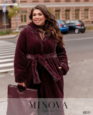 Елегантна шуба батал з підкладкою, застібається на ряд прихованих кнопок. Є капюшон, який не відстібається, з боків - кишені в шві. В комплекті пояс.