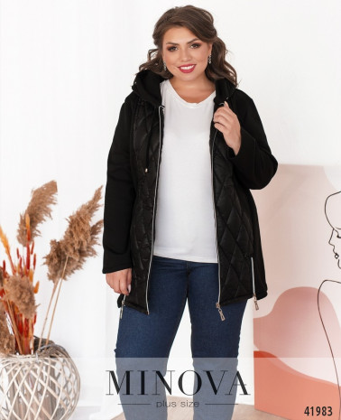 Привлекательная куртка батал с подкладкой на месте простёганных частей. Остальные части мягкие, без подкладки. В наличии капюшон с пропущенным через него шнурком. Рукава без манжет. Застёгивается на молнию по центру. Снизу спереди на подоле две молнии. На груди - декоративная нашивка. На спинке - декоративный клапан по центру. По бокам - врезные карманы.