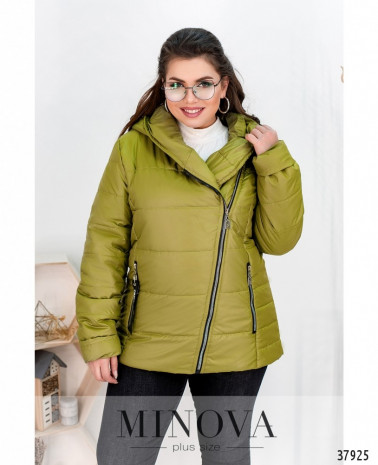 Тёплая куртка большого размера с расположенной немного наискось застёжкой-молнией. По бокам – врезные карманы с молниями, на правом кармане на бегунке – декоративная лента. В наличии капюшон. Куртка простёгана горизонтальными швами.