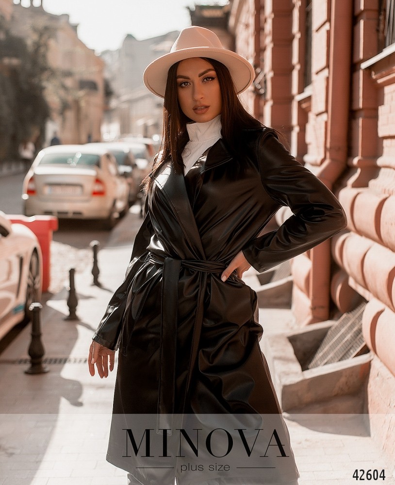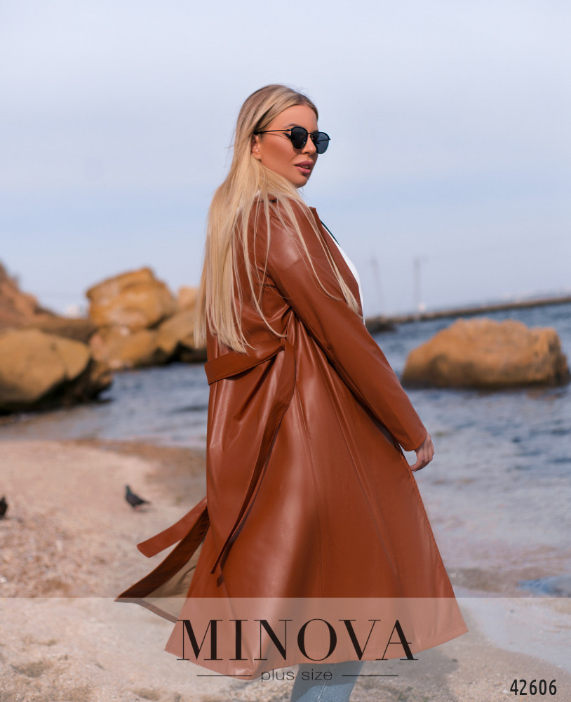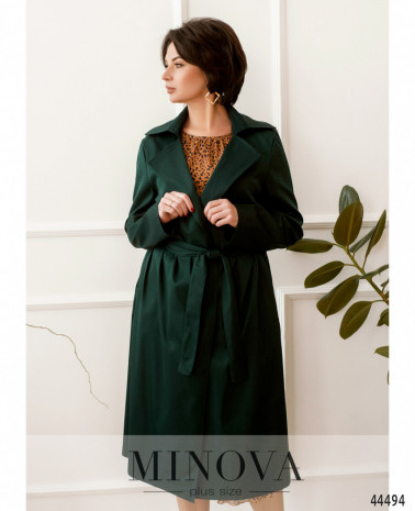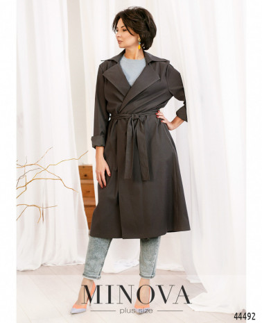 Привабливий мінімалістичний плащ без підкладки і застібок, ззаду на подолі велика шліца. На поясі з боків шлівки. Лацкани різьблені, з широкими відворотами, комір відкладний. Пояс/аксесуар входить в комплект.