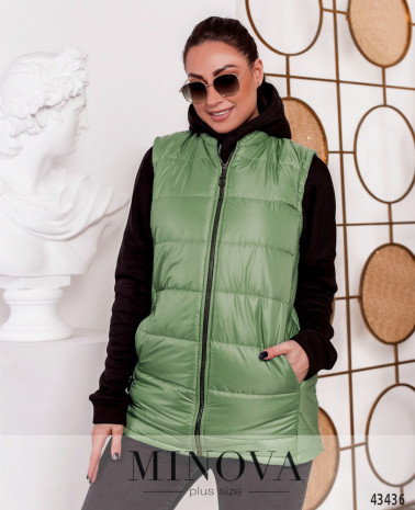 Привлекательный жилет батал с капюшоном, с подкладкой, простёганный. По бокам - врезные карманы с молнией. Застёгивается на молнию, расположенную по центру, от капюшона до низу.