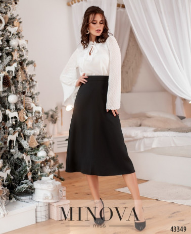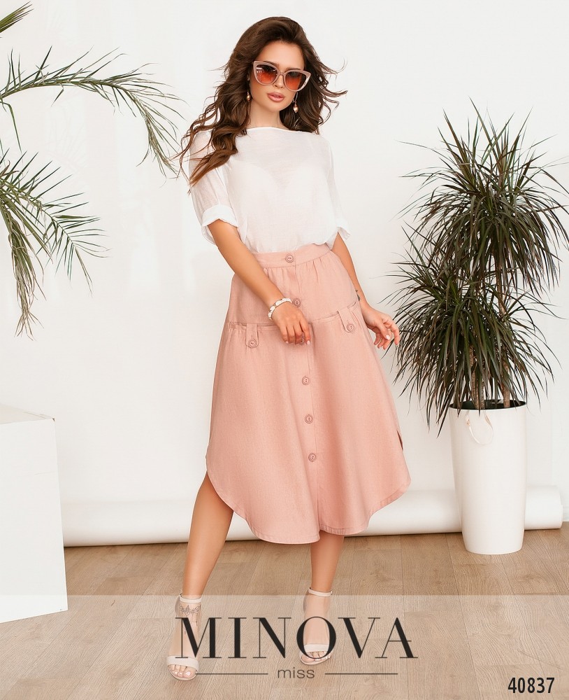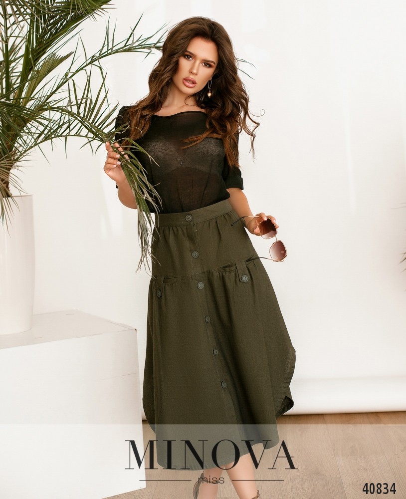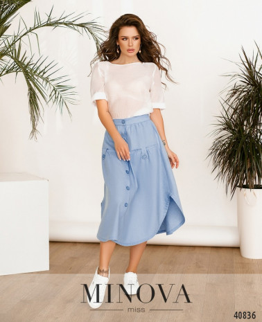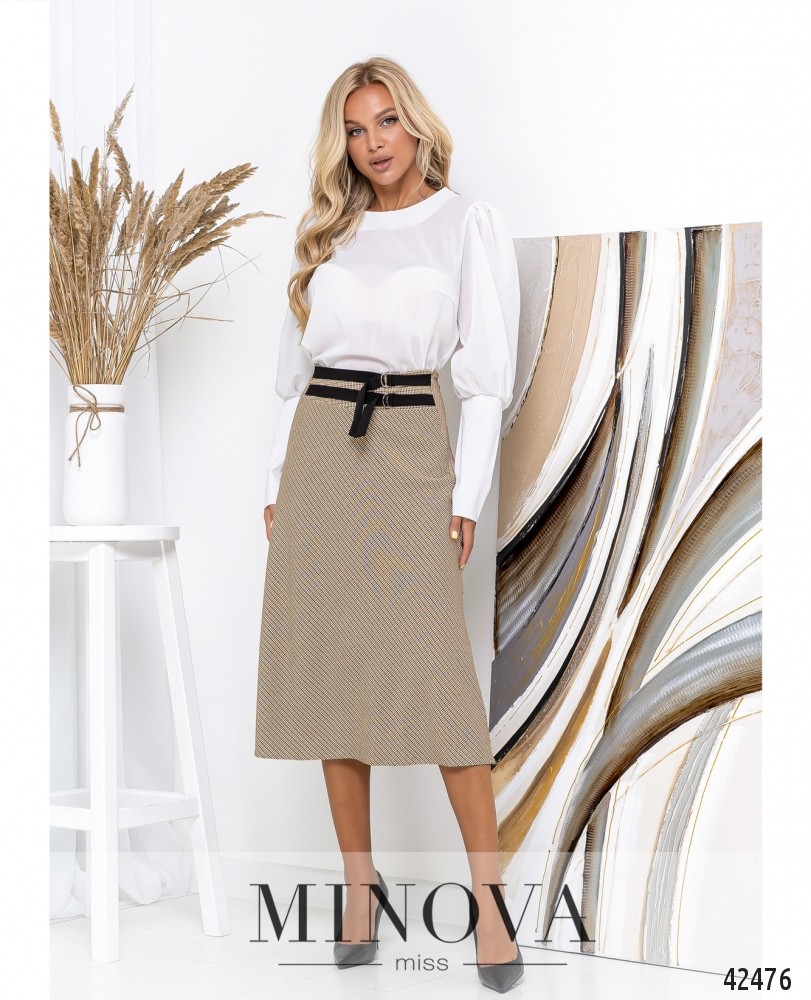 Приваблива спідниця з нашитими спереду поясками, без кишень, застібається на приховану змійку, вшиту зліва. Посадка висока.