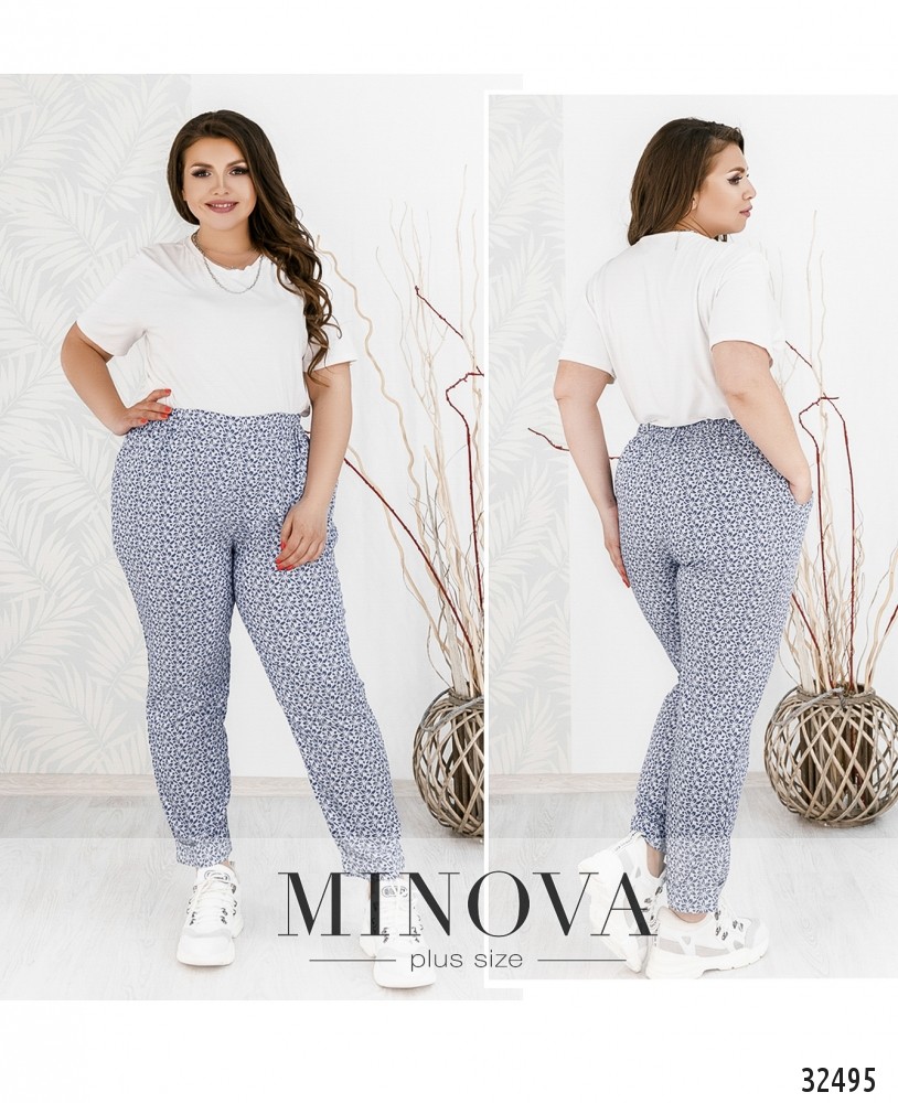 Удобные брюки батал в пижамном стиле от Minova пригодятся в летнюю жару для дома, для фитнеса или для других целей. Мелкий принт, пастельные оттенки, ткань не тянется. Отлично будет сочетаться с интересной блузой и пиджаком, или с футболкой-поло. Снизу на брючинах подвороты, пояс на резинке, присутствует декоративная «ширинка». По бокам – небольшие кармашки. Универсальность этих брюк большого размера позволит вам создавать капсульный гардероб, меняя только верхнюю часть, аксессуары и обувь. Лучше всего к ним надевать лёгкие босоножки или удобные кроссовки.