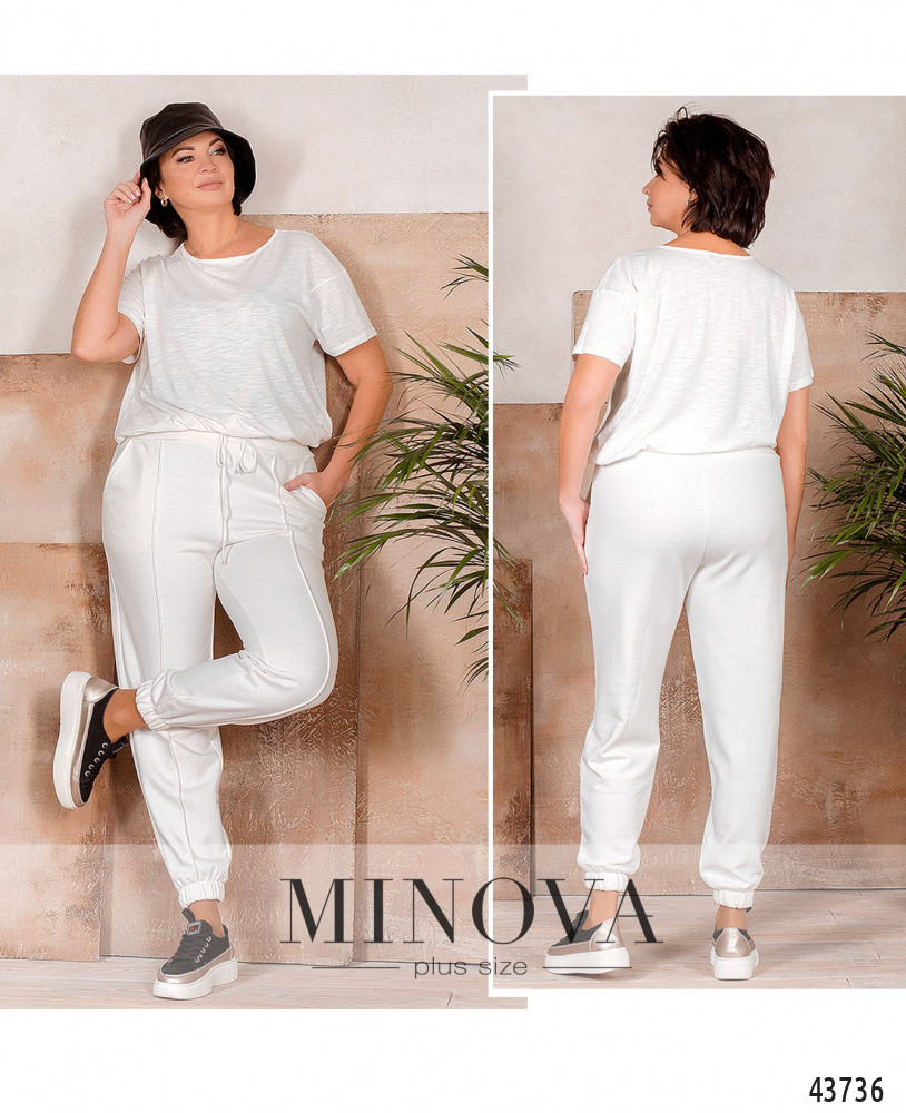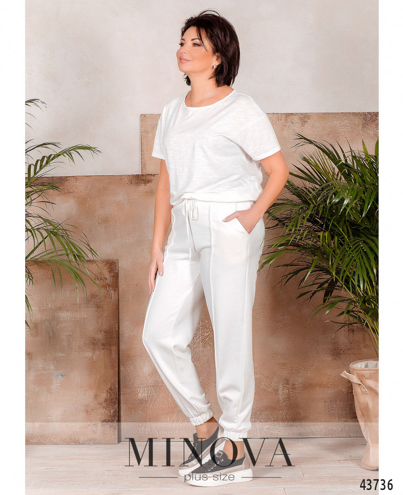 Элегантные и удобные брюки батал с нашитой "стрелкой" спереди по центру. Посадка высокая, в пояс и в манжеты вшиты резинки, по бокам - карманы в шве.