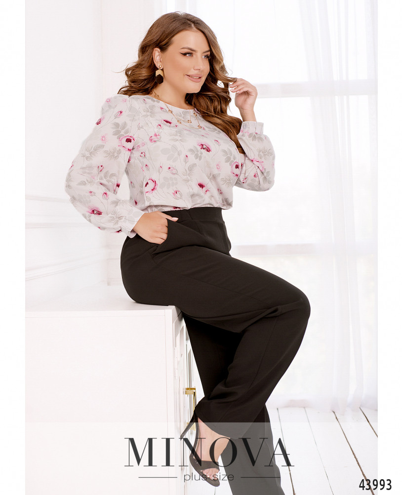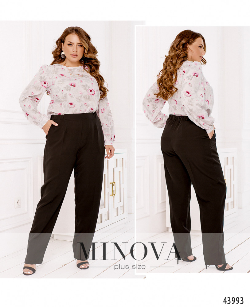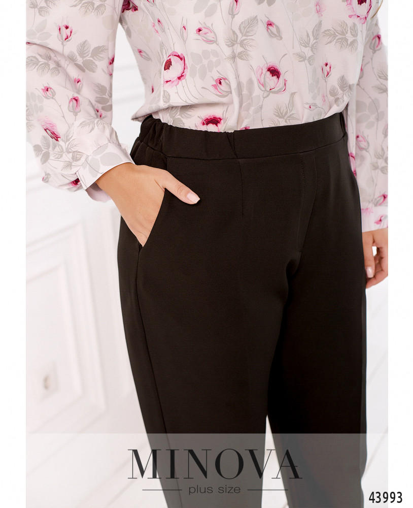 Удобные брюки плюс сайз с высокой посадкой, в пояс сзади вшита резинка, спереди - декоративная ширинка, по бокам - карманы в шве. Без застежек.