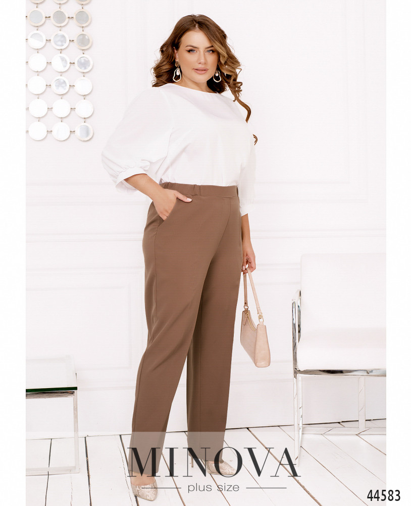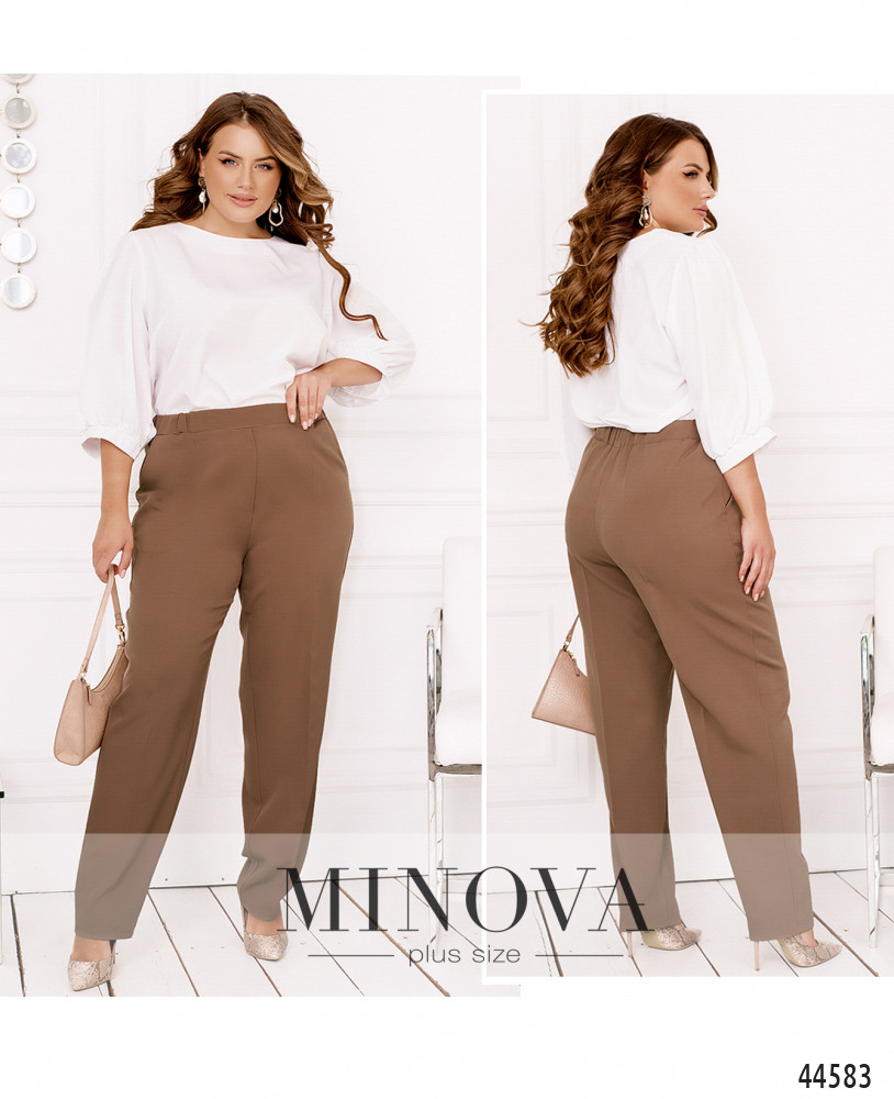 Удобные брюки плюс сайз с высокой посадкой, в пояс сзади вшита резинка, спереди - декоративная ширинка, по бокам - карманы в шве. Без застежек.