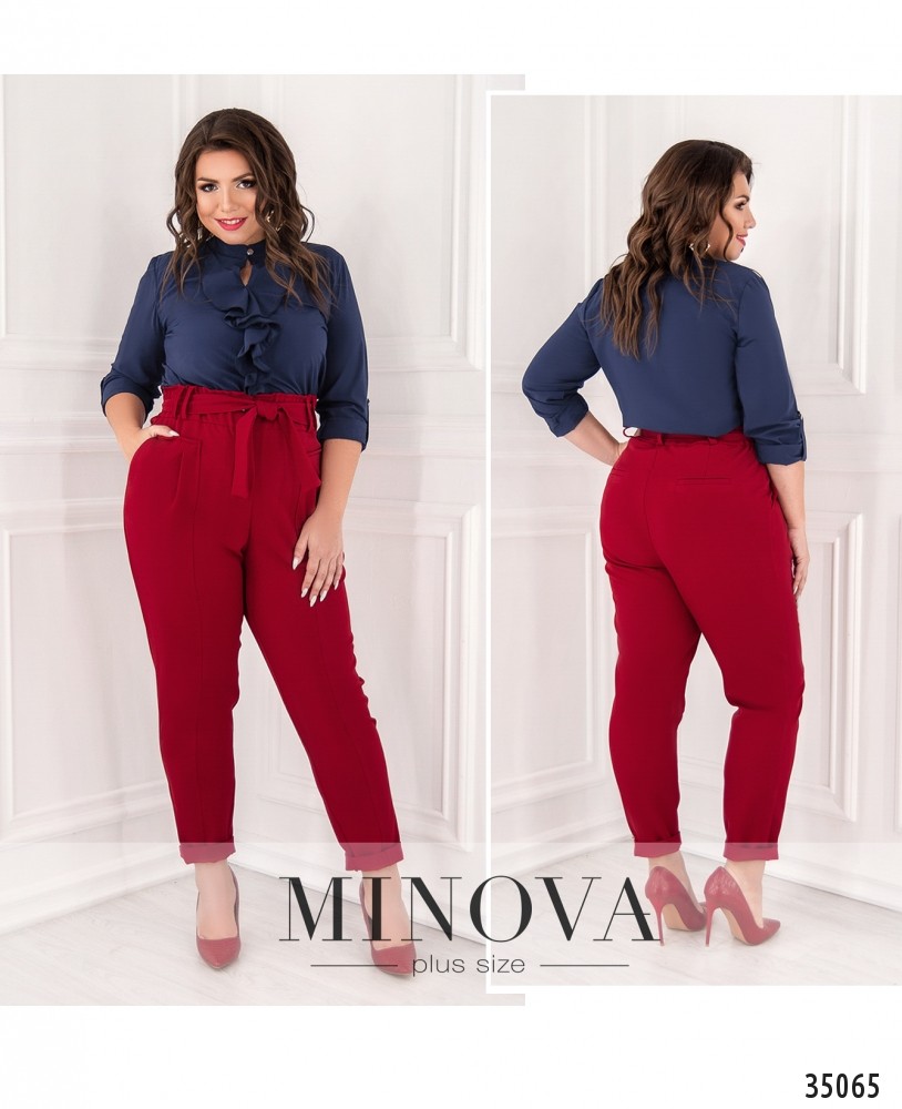Мягкие и приятные к телу брюки батал из свежей коллекции одежды от Minova позволят создать строгий деловой образ и при этом подчеркнуть свою индивидуальность! Брюки с высокой посадкой, чуть заужены к низу. На поясе – две пуговицы и рабочая змейка под ширинкой, в наличии шлейки для пояса и сам пояс. Также вшита неплотная резинка. По бокам – врезные карманы, с выделяющимся швом на внешней части. Сзади на бёдрах – декоративные клапаны. Брюки будут удачно сочетаться с классической обувью, можете выбрать тёмный, пастельный или яркий оттенок. Пояс/аксессуар входит в комплект.