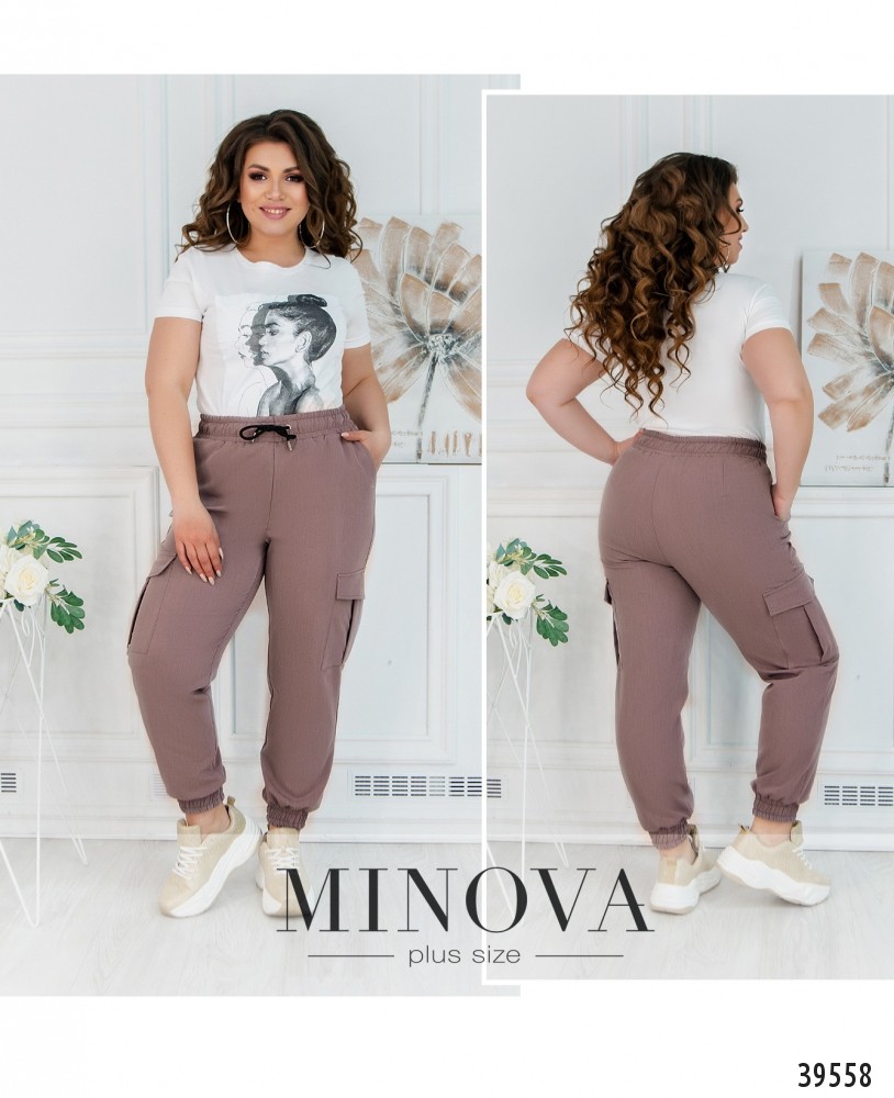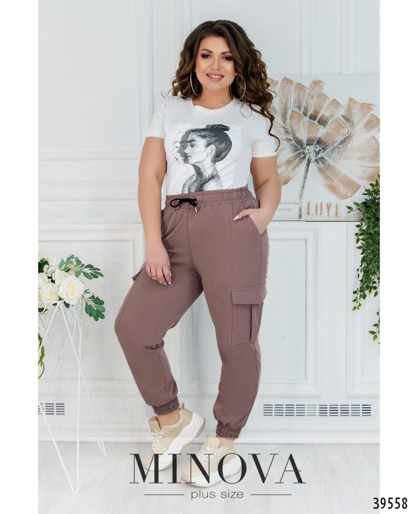 Удобные и стильные повседневные брюки большого размера, в пояс вшита резинка и шнурок, по бокам - врезные карманы и накладные карманы с клапанами, снизу манжеты с резинками.