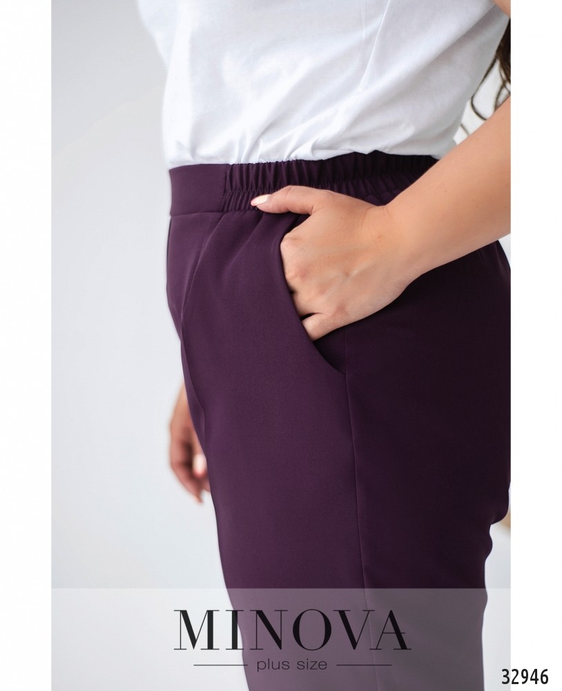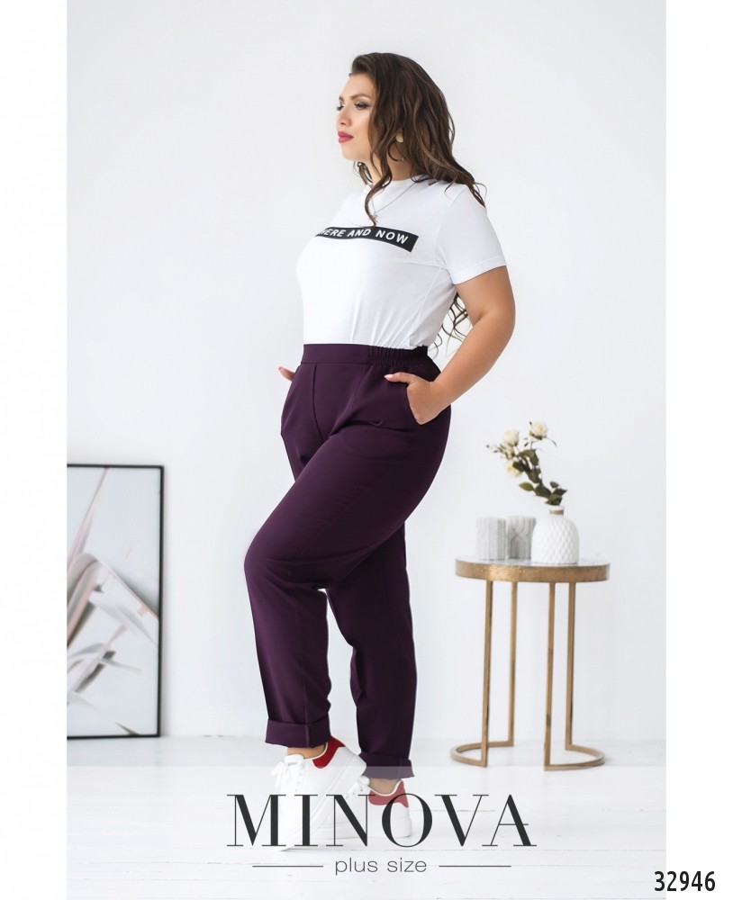 Элегантные брюки батал идеально дополнят твой рабочий наряд и любой другой официальный дресс-код. А если хочется чуть-чуть «пошалить», можно надеть тёмно-фиолетовые, главное, гармонично подобрать цвет рубашки или блузы. Впрочем, белый цвет подходит ко всему, а белых блузочек в новой коллекции Minova более чем достаточно, на любой вкус! Брюки со «стрелками», карманами, а пояс – со вшитой по бокам резинкой, поэтому застёжки не предполагается. Зато есть декоративная ширинка для соблюдения тонкостей классического стиля. Чёрные и серые брюки станут основой твоего базового гардероба!