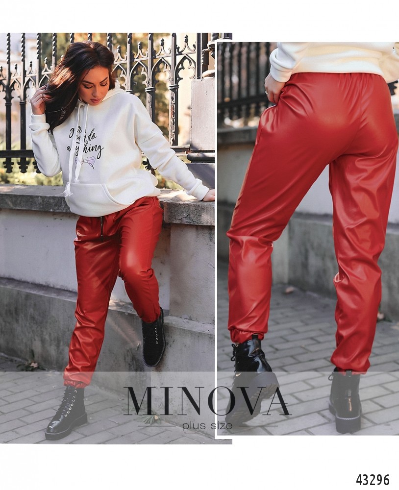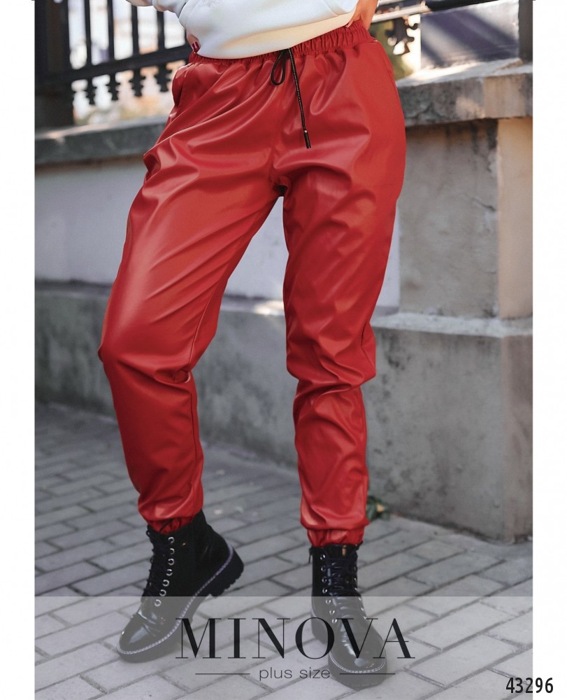 Стильные брюки батал с высокой посадкой, в пояс вшита резинка и пропущен шнурок, манжеты также на резинке. В наличии врезные карманы по бокам.