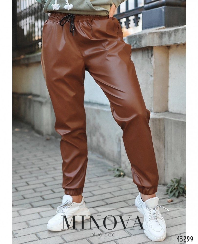 Стильные брюки батал с высокой посадкой, в пояс вшита резинка и пропущен шнурок, манжеты также на резинке. В наличии врезные карманы по бокам.