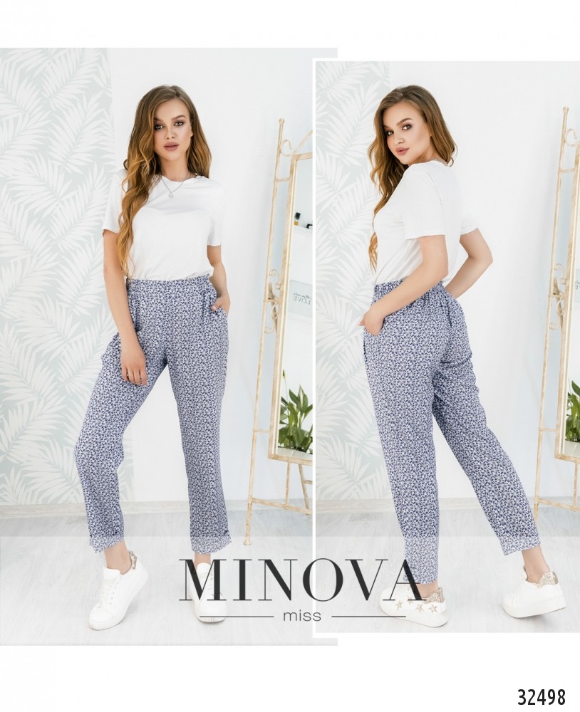 Лёгкие, летние, универсальные брюки от Minova удачно дополнят ваш летний гардероб. Их можно сочетать с лёгкими футболками, блузами или туниками. Надевать – хоть в фитнес-клуб, хоть на прогулку, хоть для домашнего времяпрепровождения. Пояс – на резинках, которые тянутся по бокам, под поясом – клапан типа «ширинки», но без застёжки. Посадка высокая, в наличии карманы. Снизу – небольшие подвороты, актуальные уже не один сезон. Силуэт – приталенный, но брюки не облегающие, а скорее свободные, классического кроя.