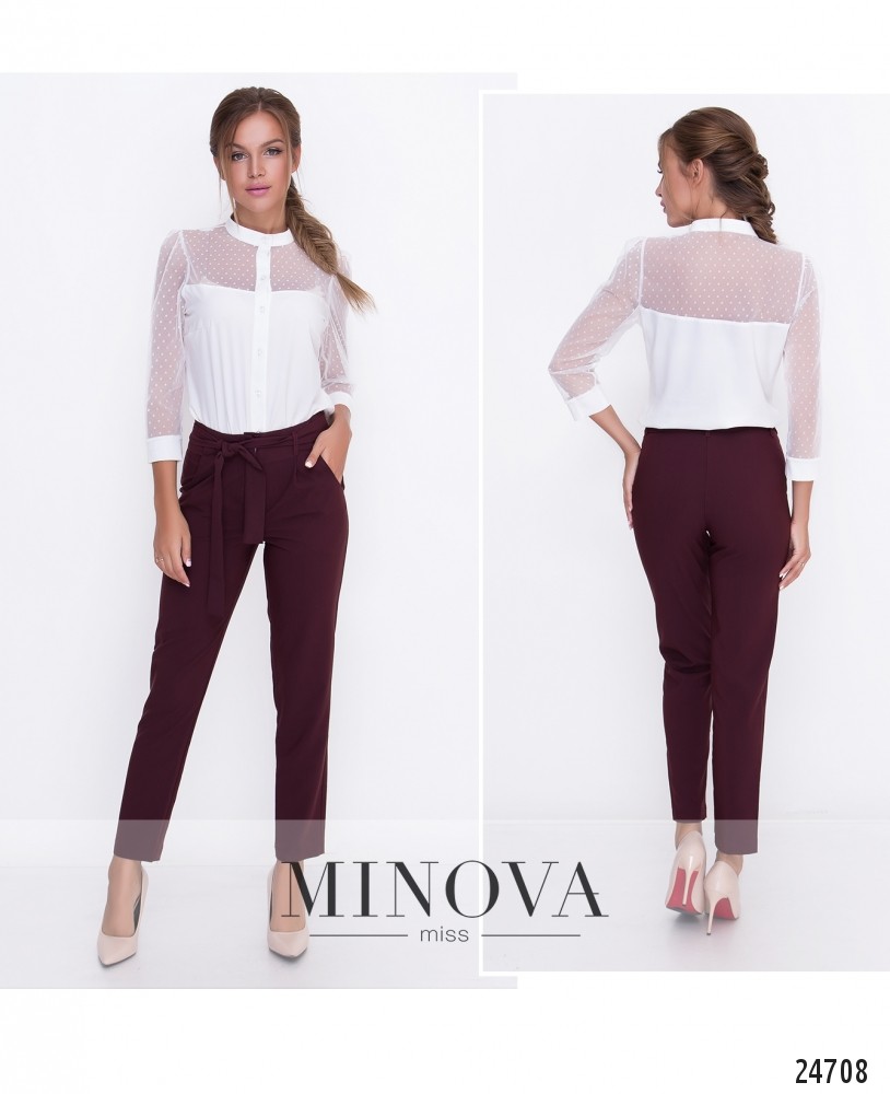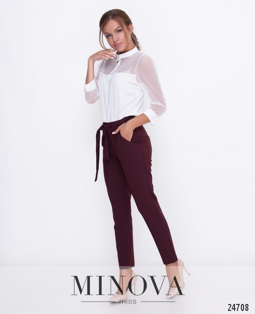 Зауженные брюки на высокой посадке с карманами и поясом с шлевками. Брюки застегивается на лицевой стороне на молнию и крючок.