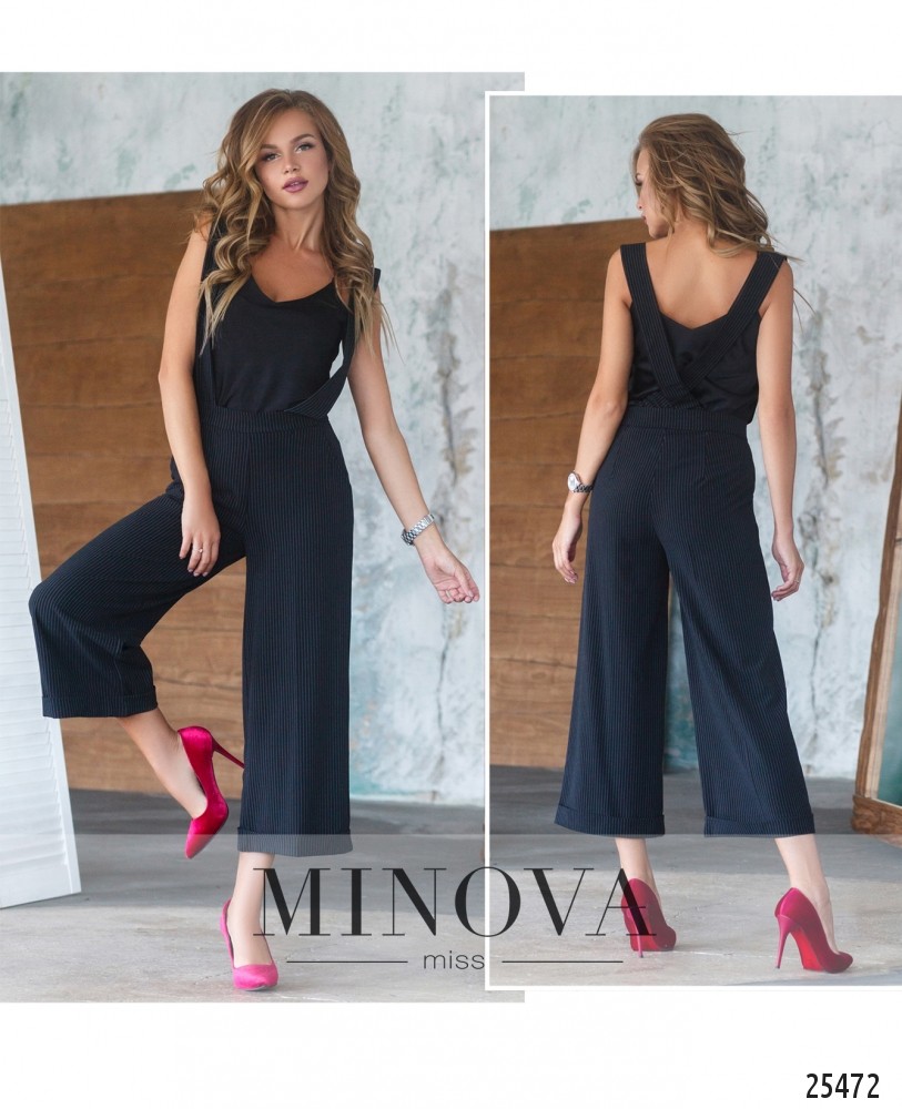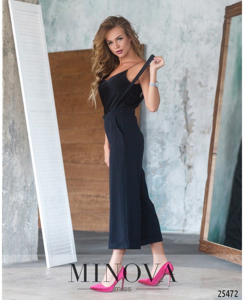 Стильные брюки-кюлоты на высокой талии с отстегивающимися шлейками. Брюки с карманами и манжетами. Скрытая молния находится сбоку. На лицевой и задней стороне шлейки застегиваются на внутренние пуговицы.