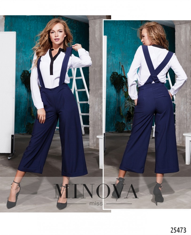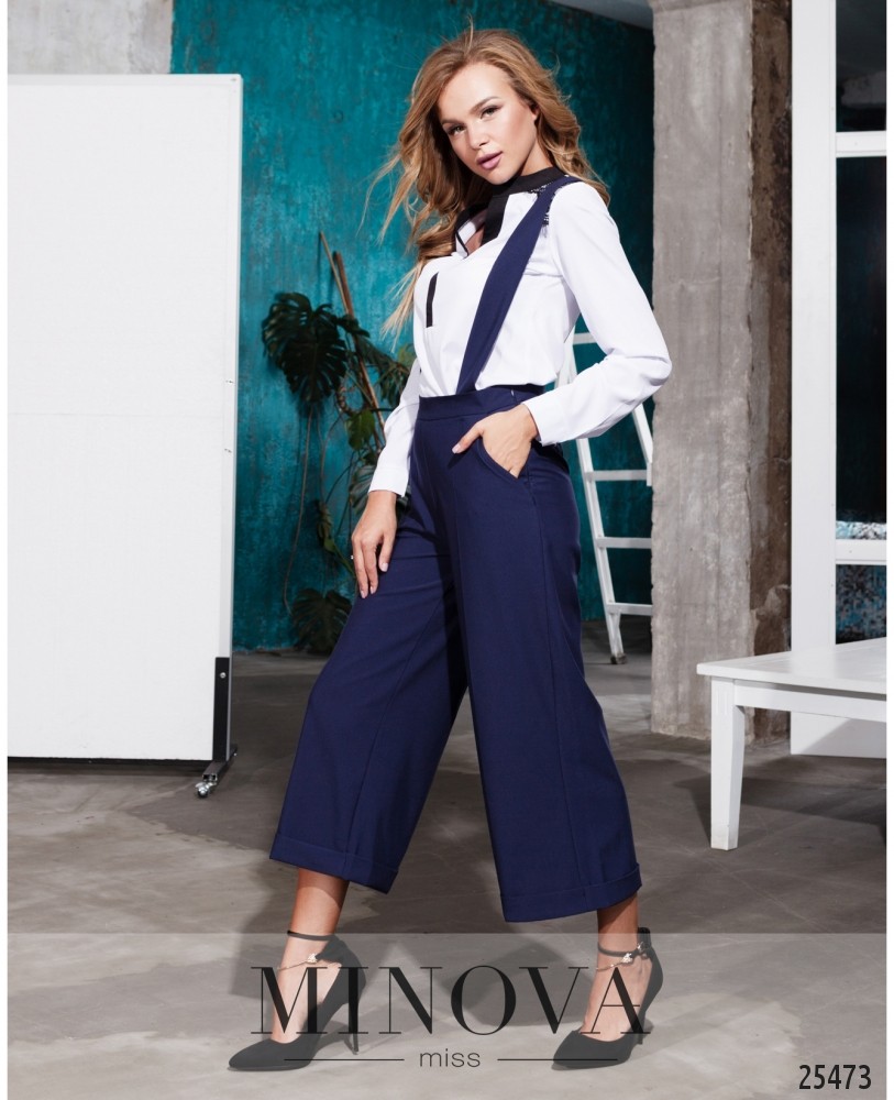 Стильные брюки-кюлоты на высокой талии с отстегивающимися шлейками. Брюки с карманами и манжетами. Скрытая молния находится сбоку. На лицевой и задней стороне шлейки застегиваются на внутренние пуговицы.