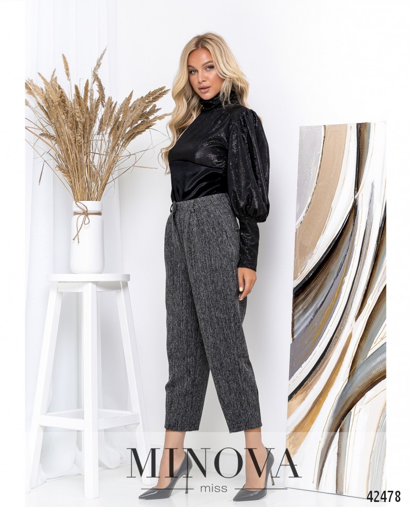 Стильные брюки с высокой талией, застёгиваются на крючки и молнию под ширинкой. По бокам - врезные карманы. На поясе шлейки для ремня и вытачки. Сзади на бёдрах накладные карманы.