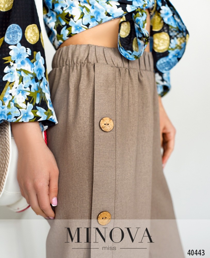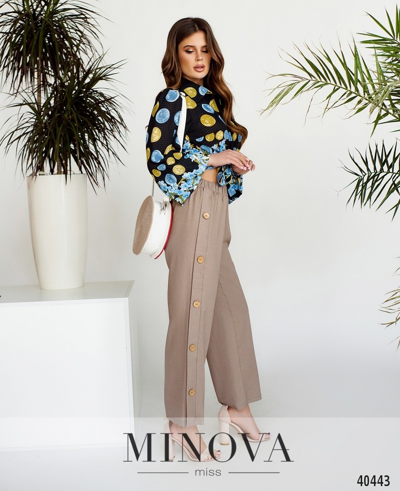 Стильные брюки с высокой талией, в пояс вшита резинка, по бокам на месте лампас - декоративные пуговицы. Без карманов и без манжет.