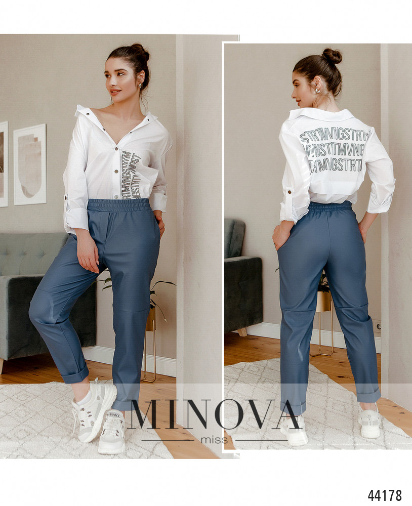Элегантные и удобные брюки с карманами в шве, в пояс вшита резинка, изнутри - гладкий подкладочный слой. На бёдрах - декоративные швы, под поясом - декоративная ширинка. Снизу подвороты.