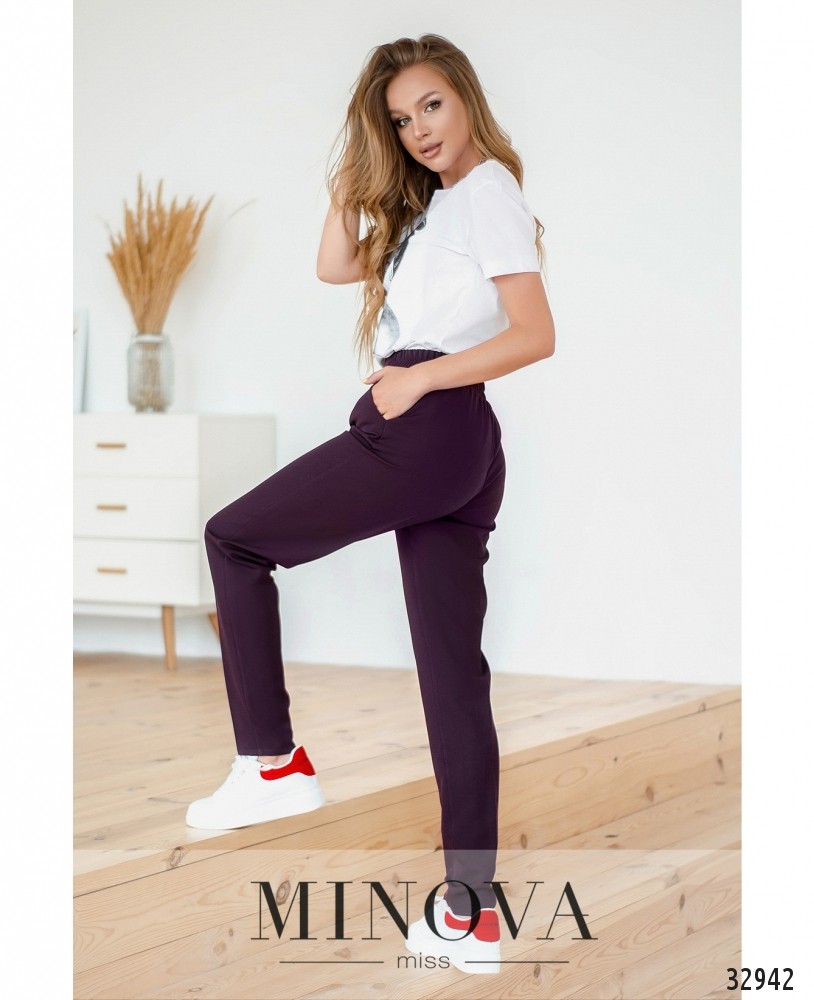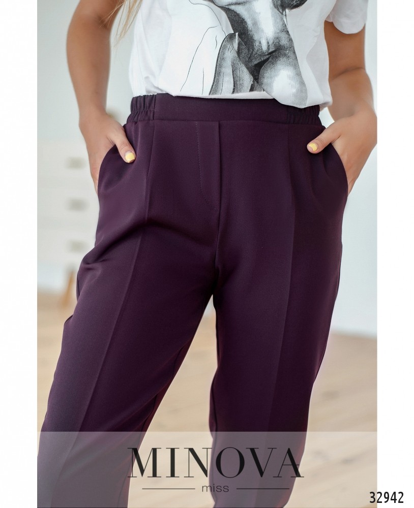 42 р-р: длина брюк по внутреннему шву 80см, длина брюк по внешнему шву с учетом пояса 104см, ОТ – 65/75см, ОБ – 95см.