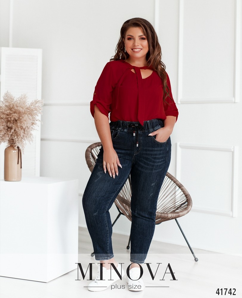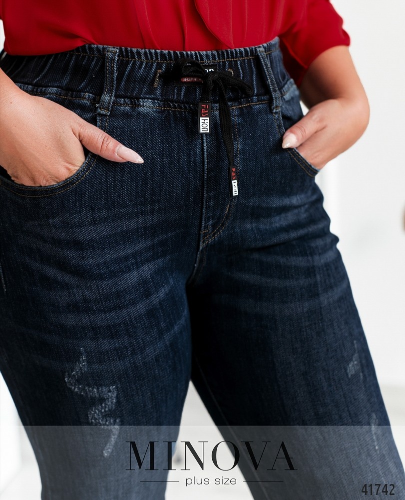 Привлекательные джинсы большого размера с врезными карманами по бокам и с накладными карманами сзади на бёдрах. В пояс вшита резинка, пропущен шнурок, посадка высокая. Застёжек нет, есть декоративная ширинка спереди.