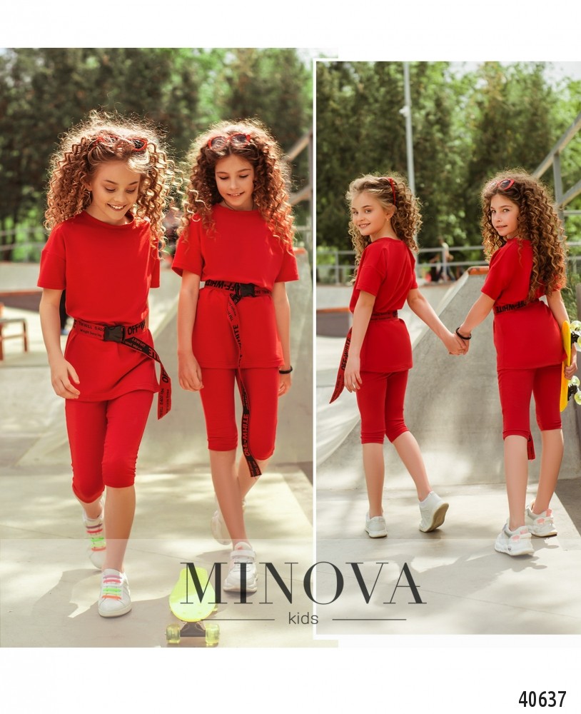 Лёгкий спортивный костюм в яркой расцветке, без принтов, с привлекательным поясом. Футболка без застёжек и карманов, в пояс бриджей вшита резинка, карманов нет.
