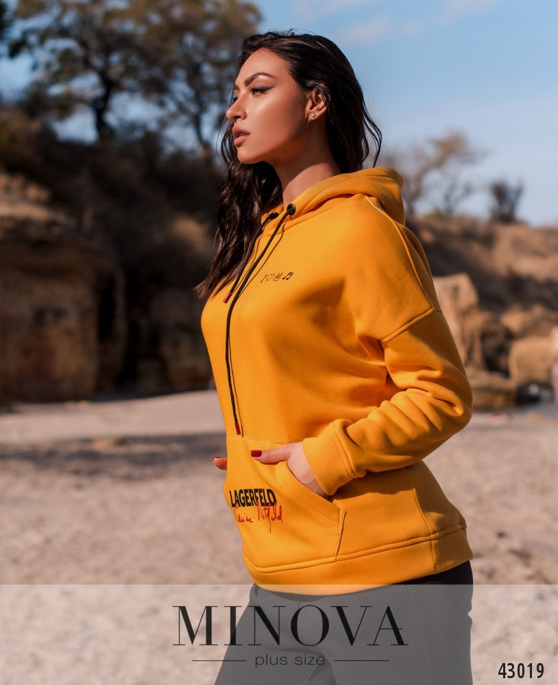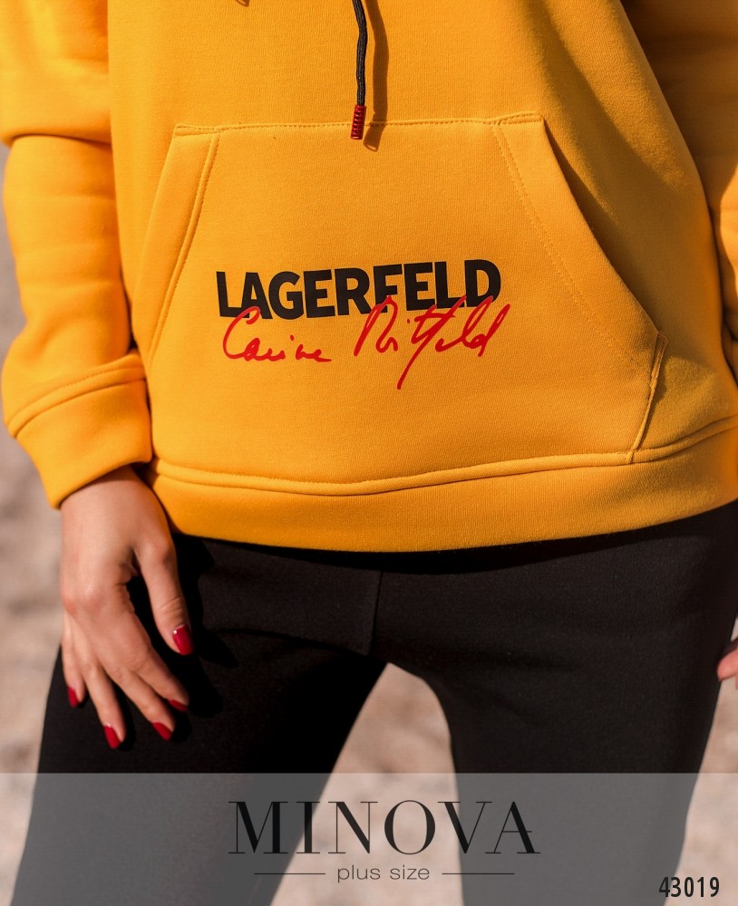 Мягкая толстовка большого размера с накладным сквозным карманом на талии. Через капюшон пропущен шнурок. Рукава и подол с манжетами. Застёжек нет. На груди и на кармане - принты.