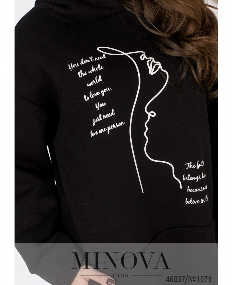 Стильная комфортная туника с принтом отличается универсальностью, а также удачно вписываются в любой стиль. Модель свободного кроя дополнена длинными рукавами с приспущенной линией плеч и капюшоном.