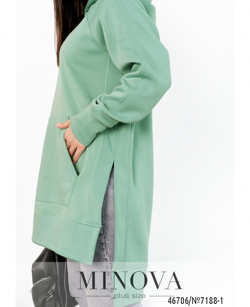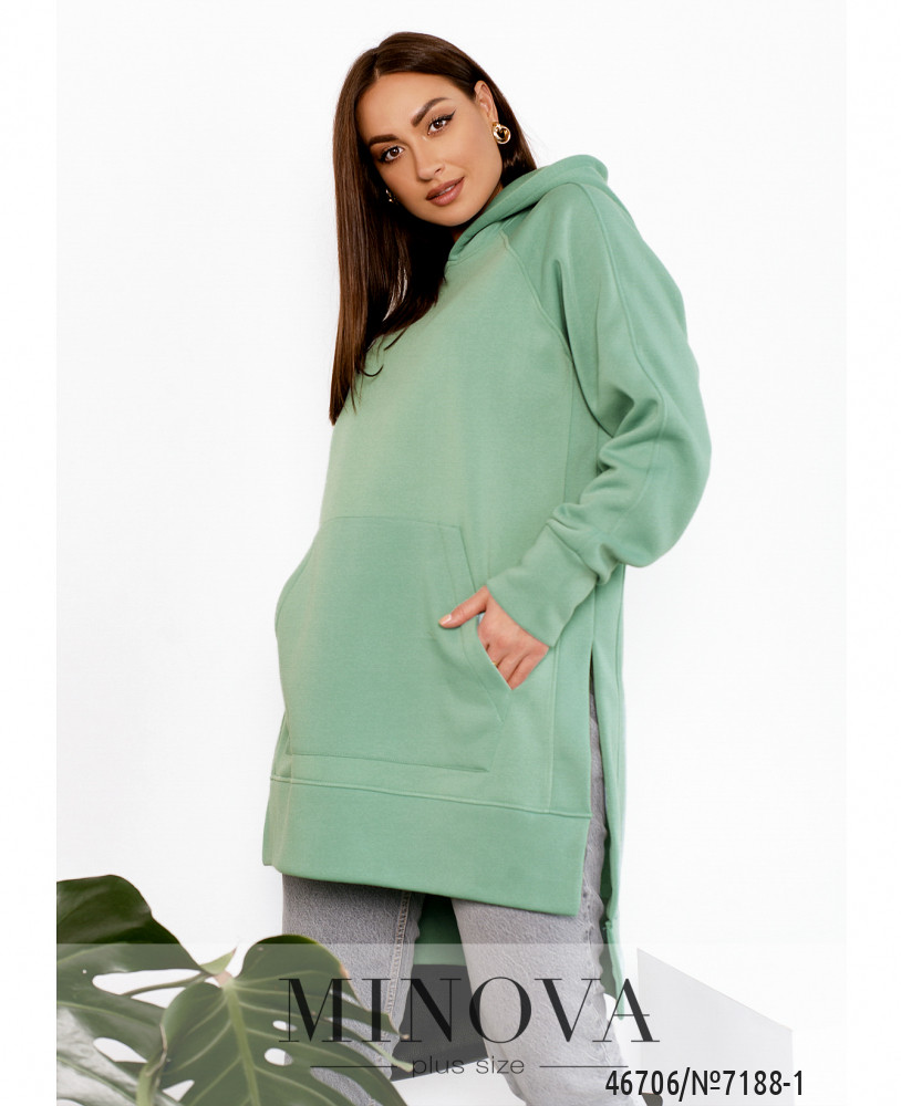 Мягкая лаконичная туника-худи отличается универсальностью, а также удачно вписываются в любой стиль. Модель свободного кроя дополнена длинными рукавами "реглан" с манжетами, карманом-кенгуру, капюшоном, разрезами по бокам, обеспечивающими дополнительный комфорт, и ассиметричным подолом.