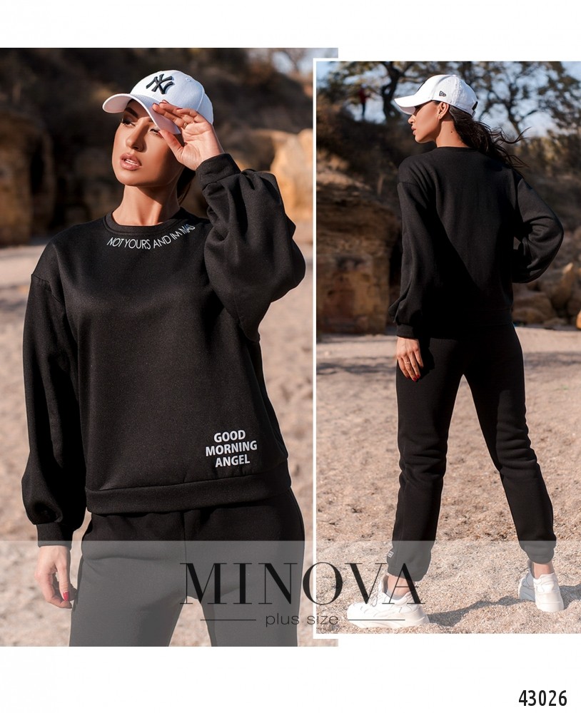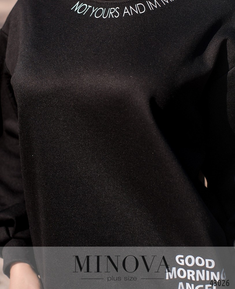 Оригинальная толстовка батал с принтом под вырезом горловины и на бедре. Епископские рукава, с мягкими манжетами. Застёжек и карманов нет.