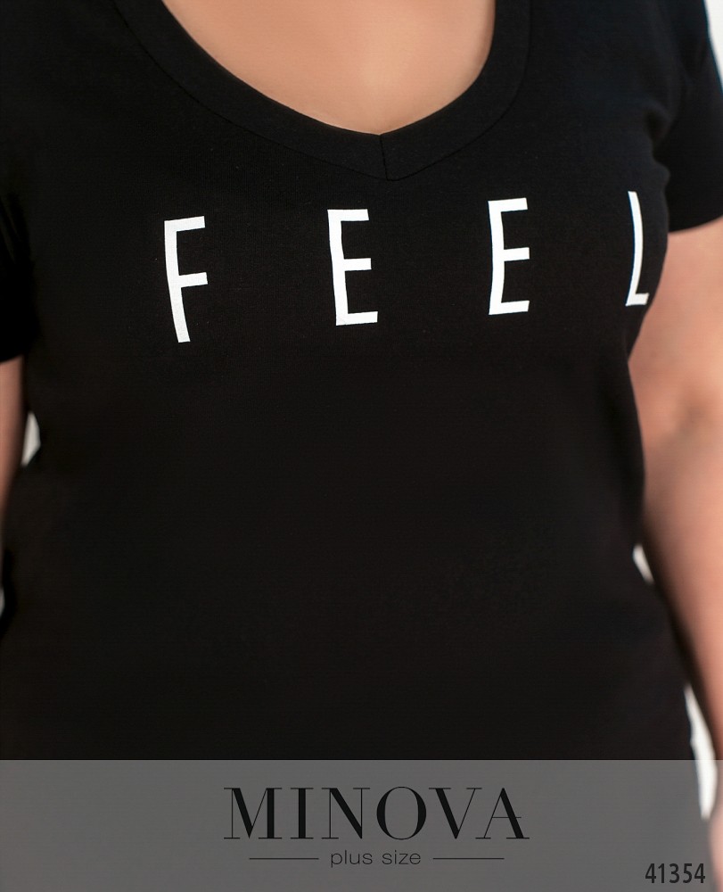 Удобная минималистичная футболка большого размера с принтом на груди, вырез горловины скруглённый V-образный. Без застёжек и карманов.