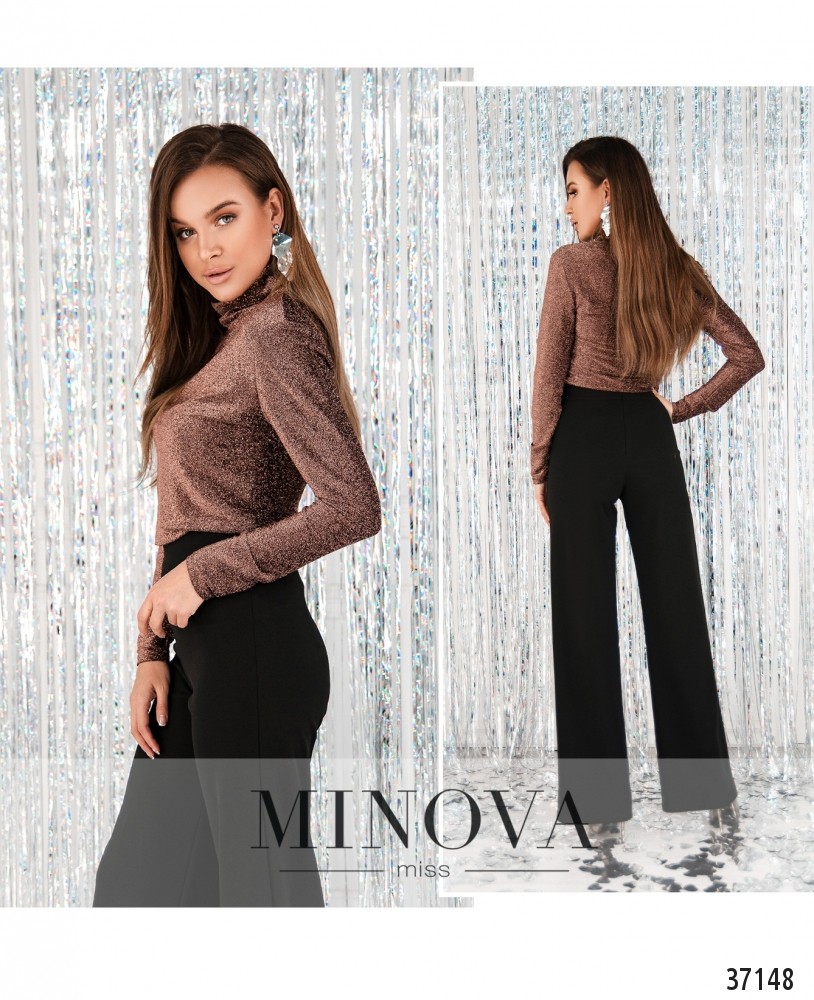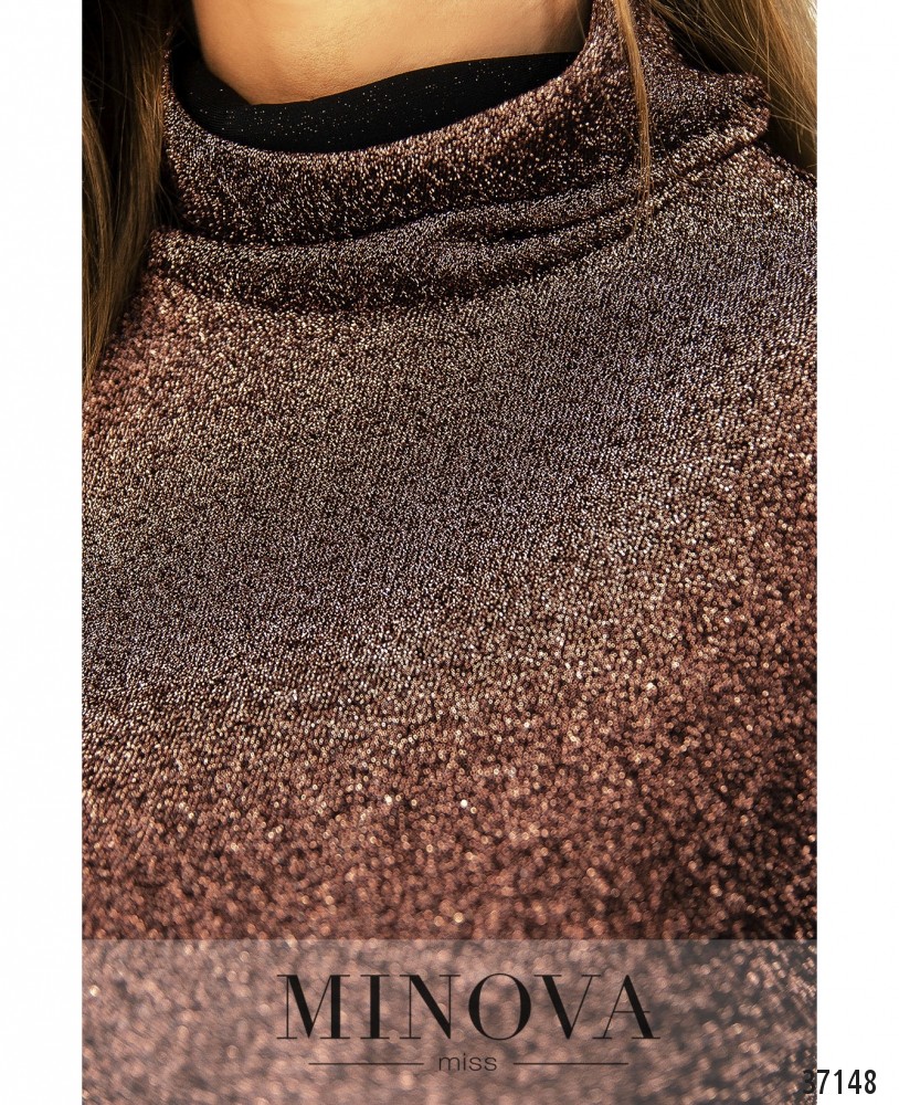 Блестящий нарядный гольф из мягкой ткани с люрексом, изнутри гладкий. Воротник высокий, рукава полной длины, без манжет. Застёжек, карманов и вытачек нет. Длина до бедра.